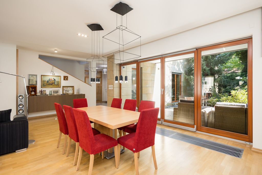 Wnętrze projektowano z myślą o maksymalnej wygodzie i intuicyjnej funkcjonalności. Pomieszczenia zachwycają przestronnością i doskonałym doświetleniem, uzyskanym dzięki imponującym przeszkleniom, które płynnie łączą dom z otaczającym go ogrodem. Stan techniczny jest wzorowy — budynek był regularnie konserwowany i utrzymywany z pedantyczną dbałością o każdy detal. Wysokość pomieszczeń, oscylująca między 270 a 280 cm, potęguje wrażenie swobody.