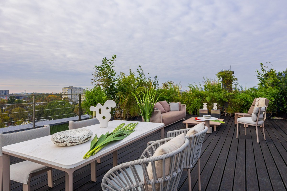 Największą perłą jest ponad 160-metrowy taras na dachu, z którego rozpościera się niezmienny, panoramiczny widok na miasto i zieleń Górnego Mokotowa. To przestrzeń tak wyjątkowa, że oferuje doświadczenie prywatności, spokoju i swobody, którego nie znajdzie się w żadnym innym apartamencie w Warszawie.