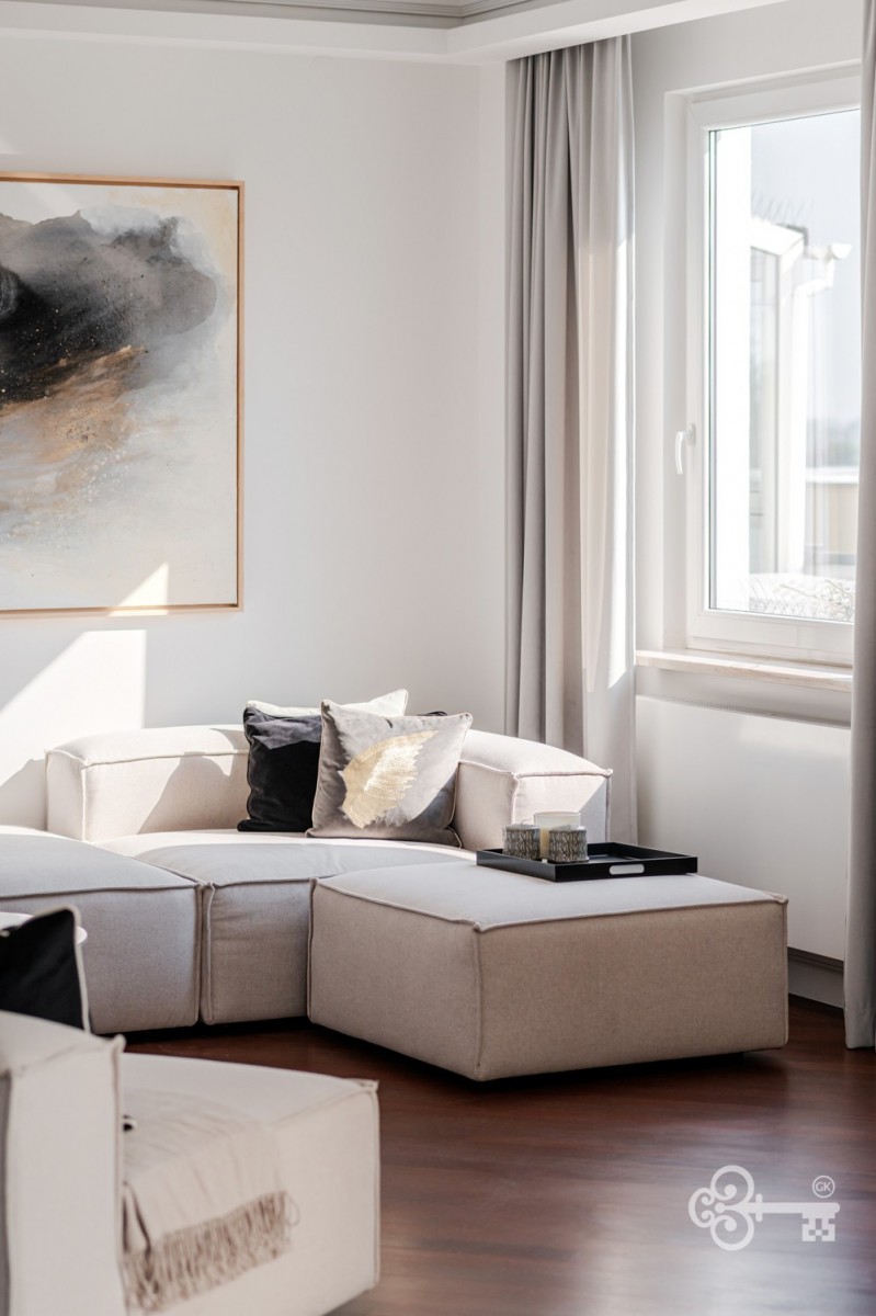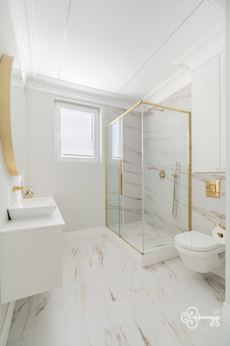 Apartament po generalnym remoncie, wszystkie sprzęty AGD są nowe. Klimatyzacja została zamontowana w każdym pomieszczeniu. Wyróżnia się przestronnością i starannie dobranym wyposażeniem – każdy pokój oraz hall posiadają drewnianą zabudowę na wymiar. Elegancki hall oddziela część dzienną od części prywatnej, zapewniając komfort i prywatność. Mieszkanie niezwykle jasne i słoneczne.