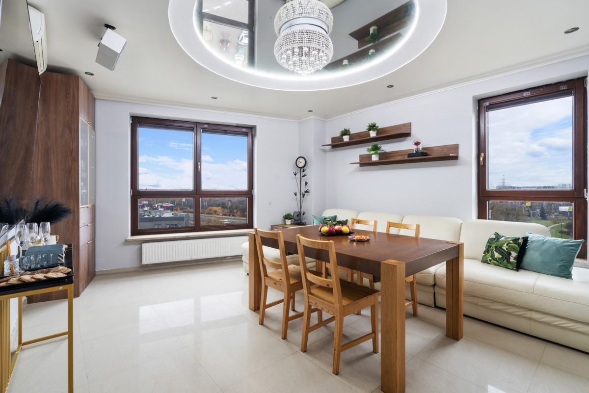 Salon z dużymi oknami i wyjściem na balkon – jasny, elegancko urządzony, idealny do rodzinnych spotkań.