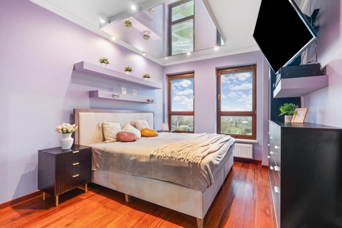 Sypialnia główna z dużym łóżkiem typu king size (2×2 m) i przestronną szafą w zabudowie.