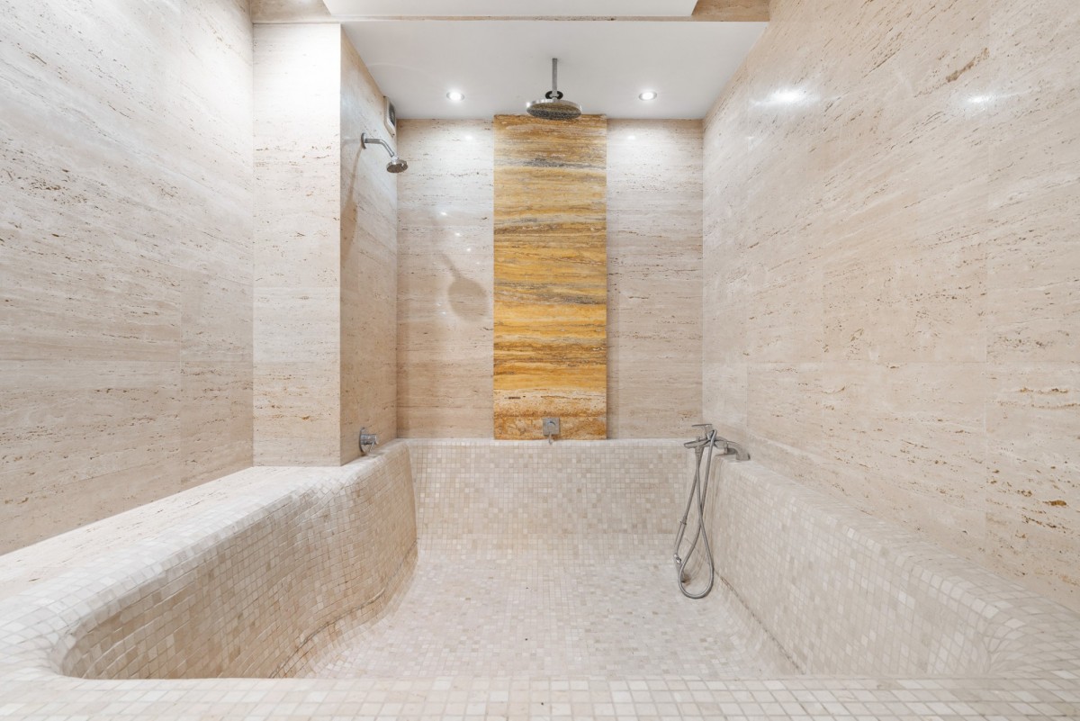 Luksusowa łazienka z unikalną, marmurową wanną dla sześciu osób – strefa relaksu w domowym spa.