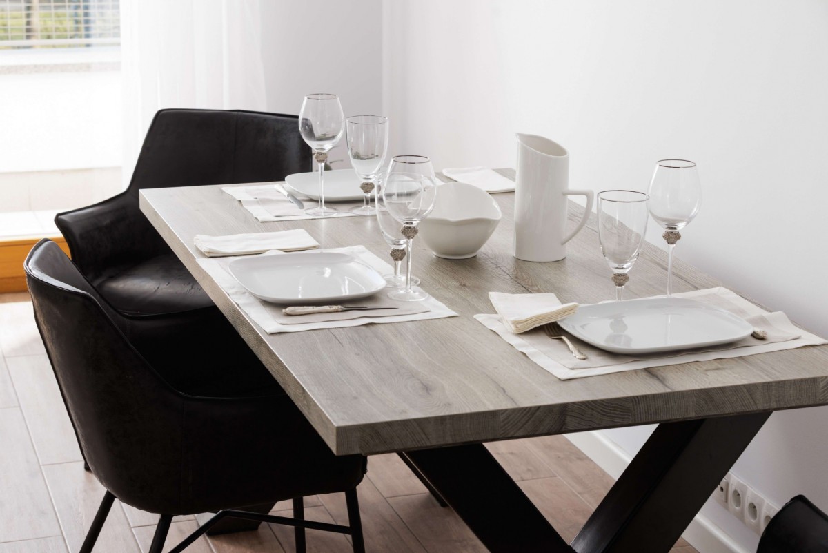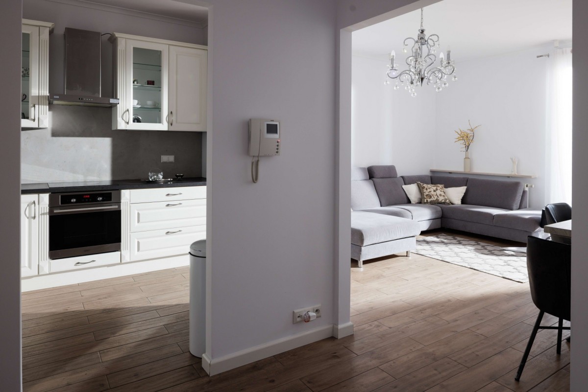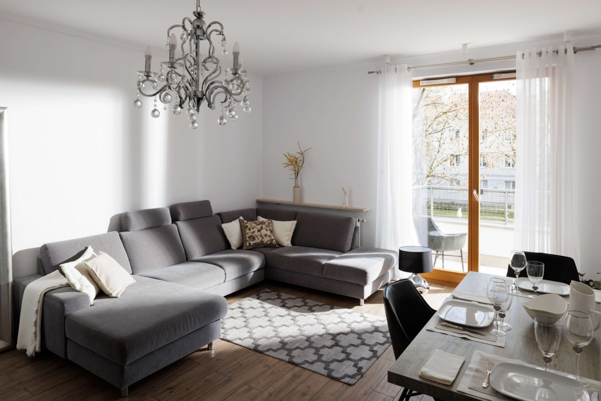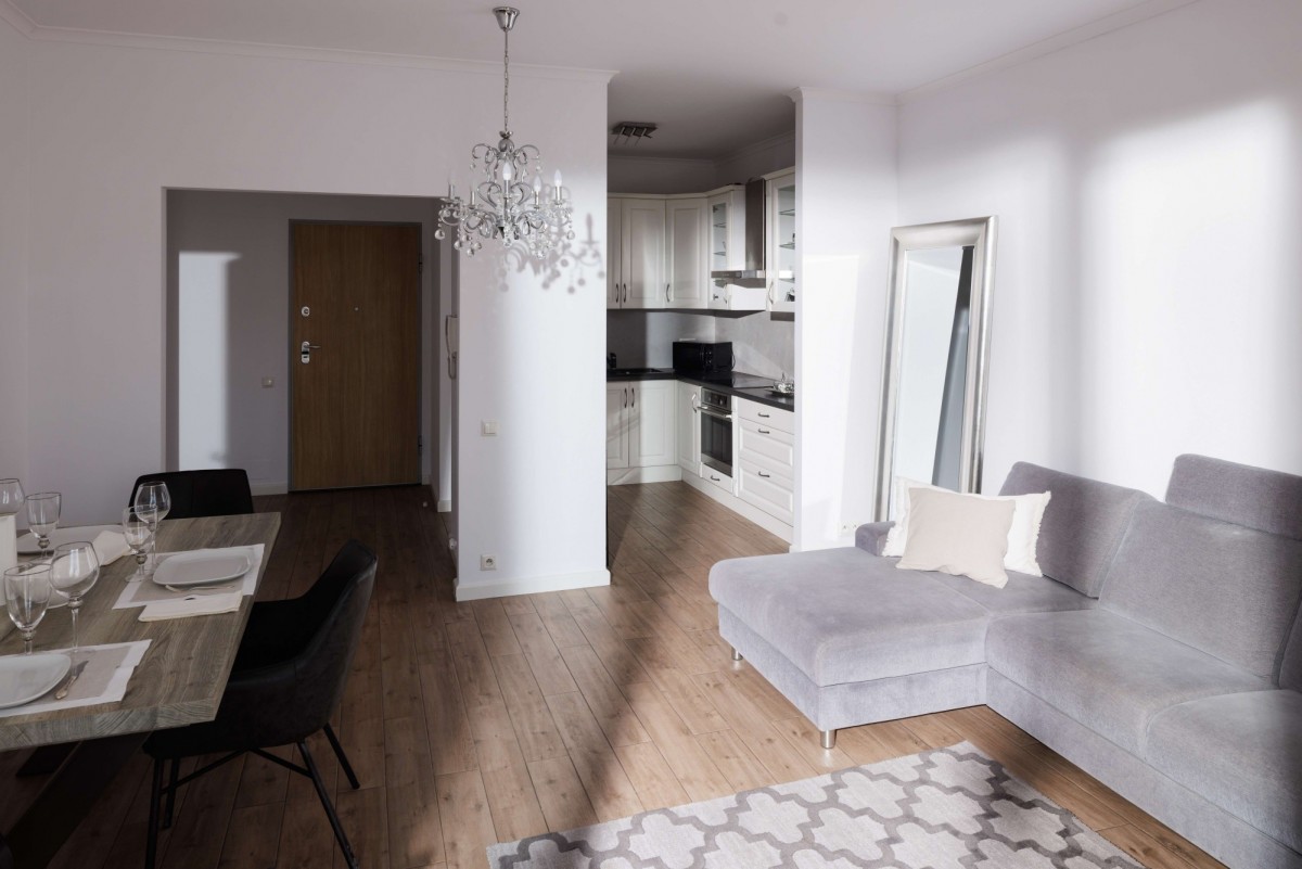 - jasnego salonu z balkonem z wygodną kanapą i strefą jadalnianą,