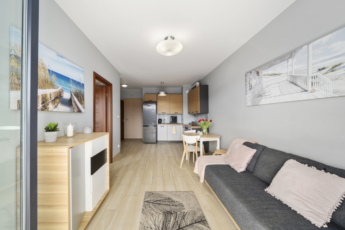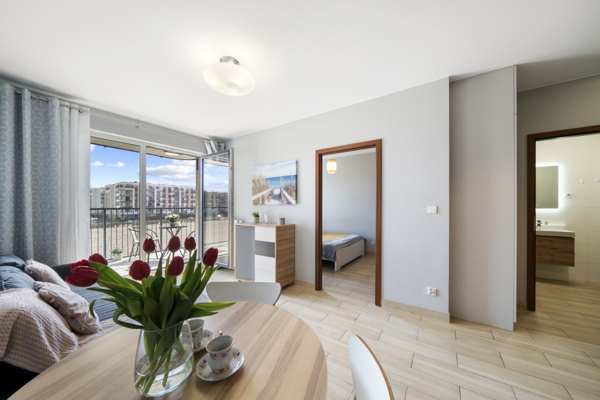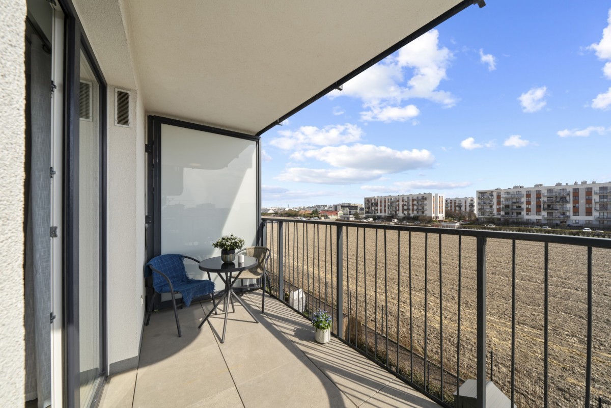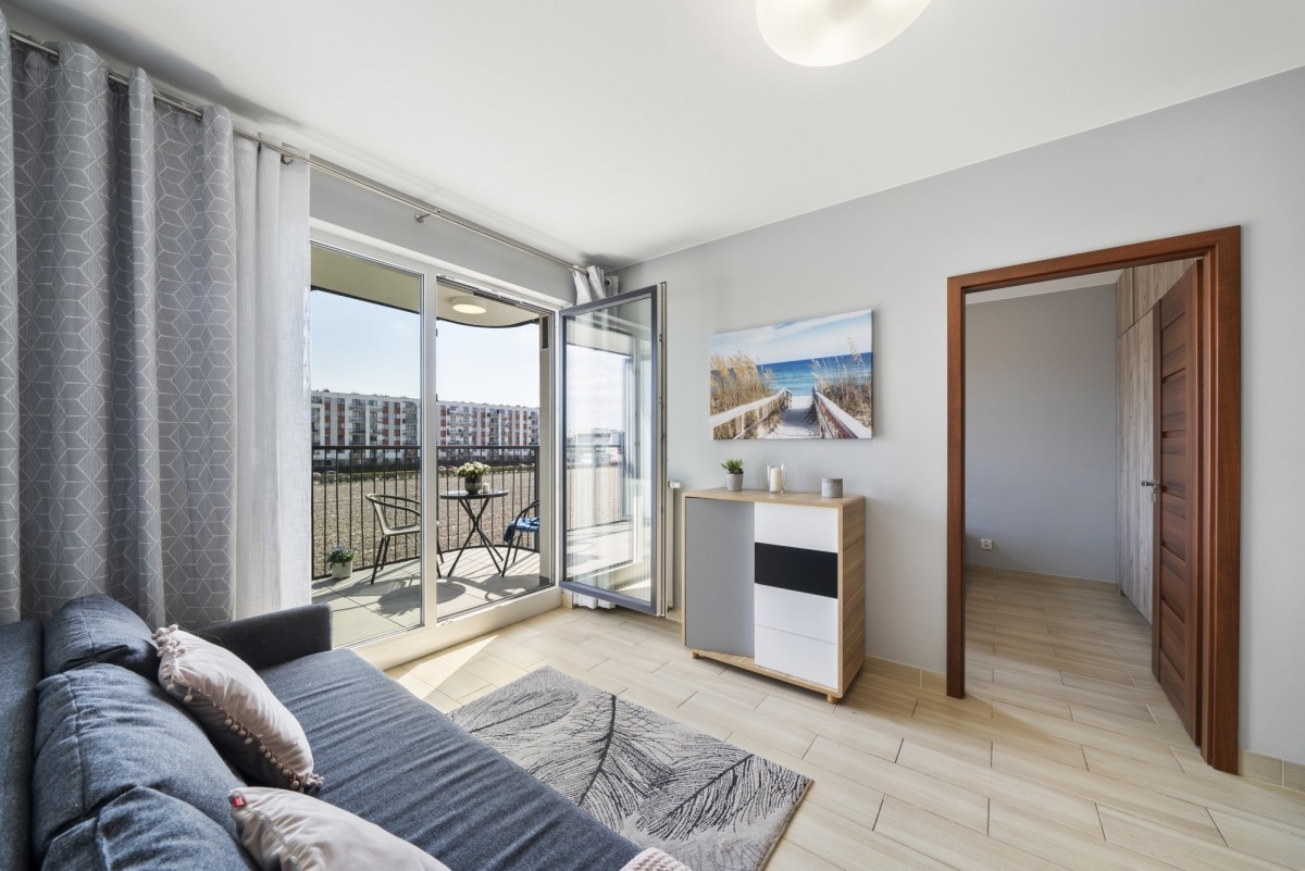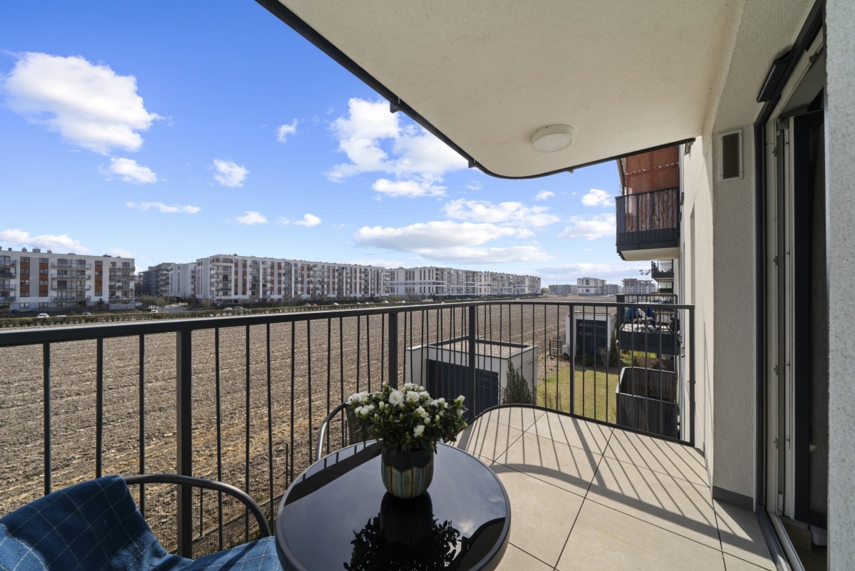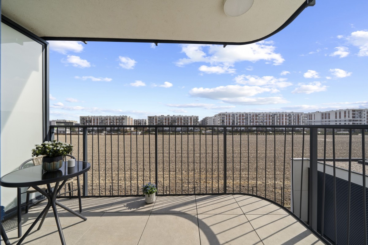 Z salonu prowadzi wyjście na przestronny balkon, idealne miejsce na poranną kawę lub relaks po pracy. Przemyślany układ pomieszczeń zapewnia komfort zarówno dla jednej osoby, jak i dla pary.