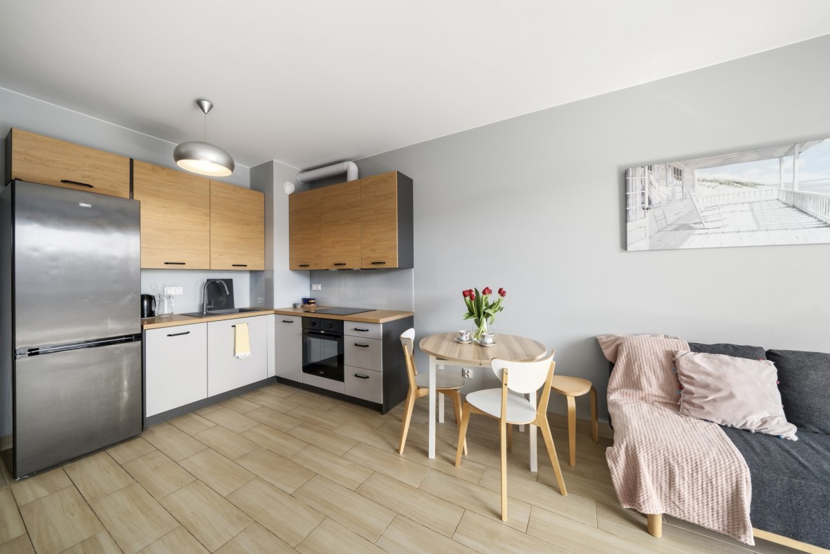 Kuchnia: nowoczesna zabudowa oraz pełne wyposażenie AGD: duża lodówka, płyta indukcyjna, piekarnik, okap, zmywarka, czajnik elektryczny.