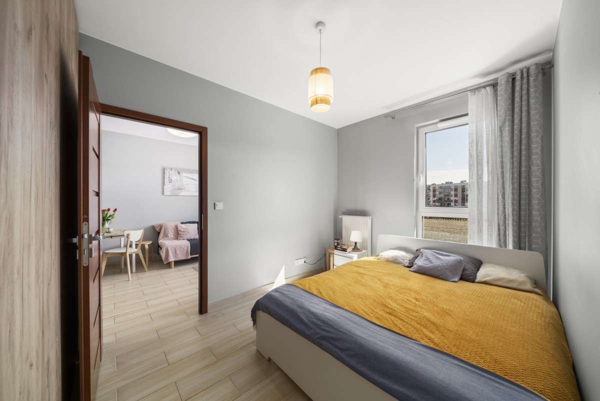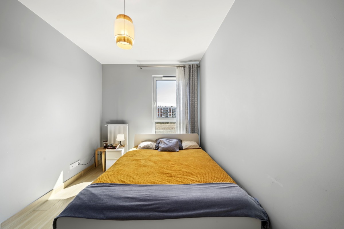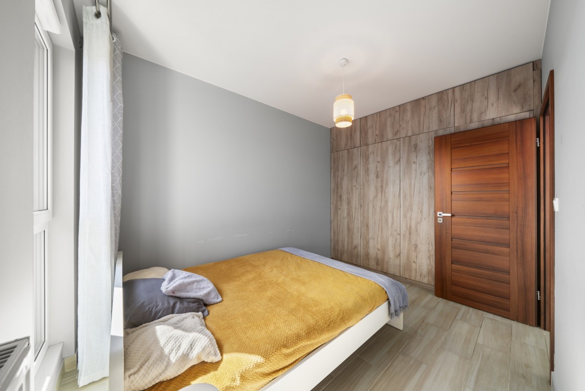 Sypialnia: duże łóżko dwuosobowe, szafka nocna oraz pojemna szafa wnękowa na całą ścianę; duże okno zapewnia dużo naturalnego światła.