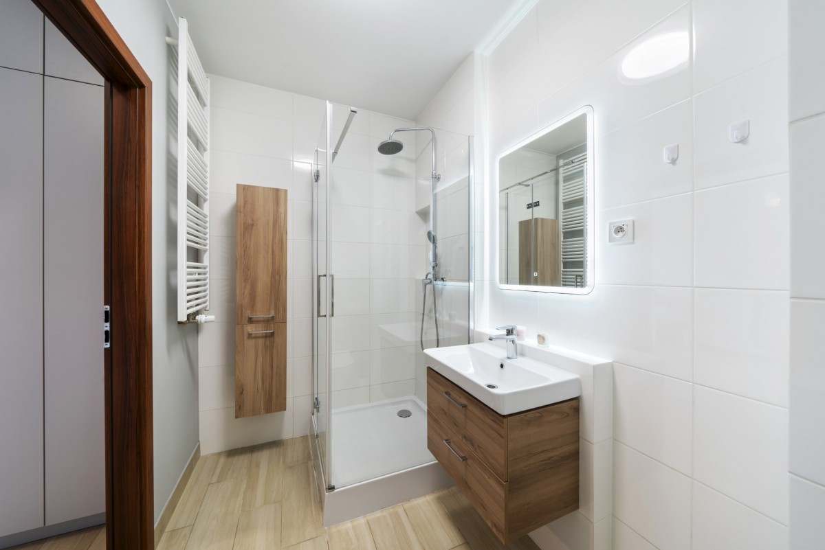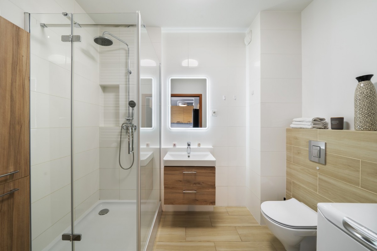 Łazienka: duży prysznic, umywalka z szafką, podświetlane lustro, WC, pralka oraz dodatkowa szafka wisząca.