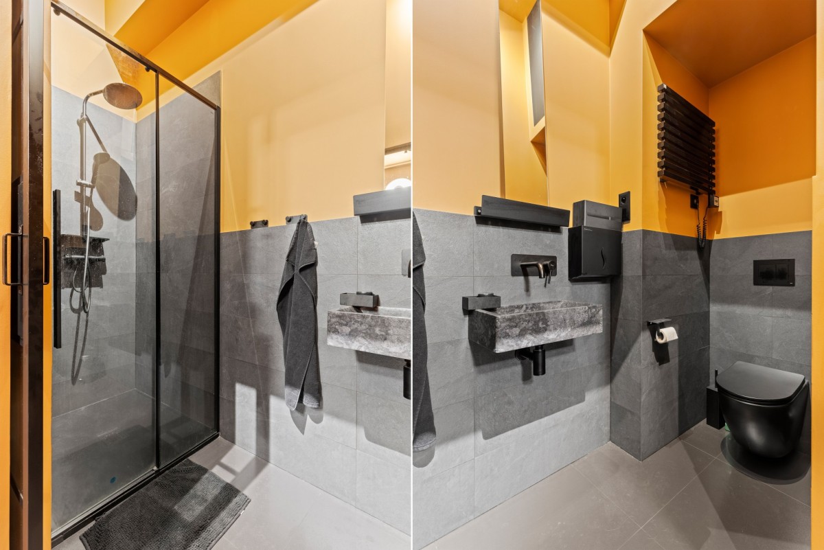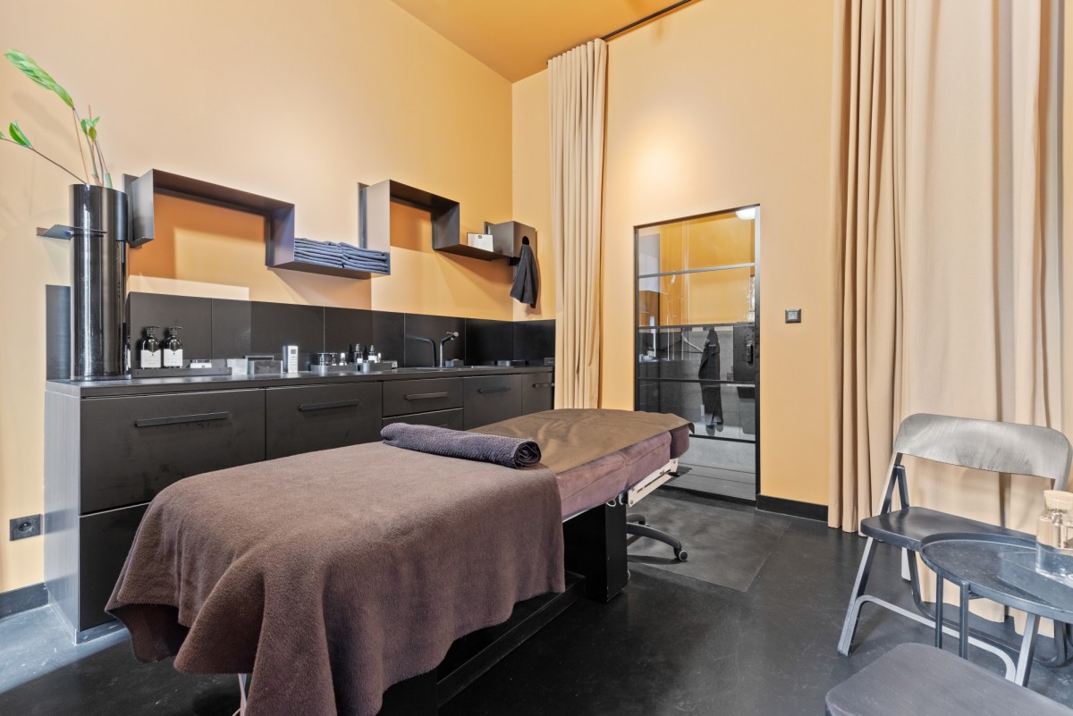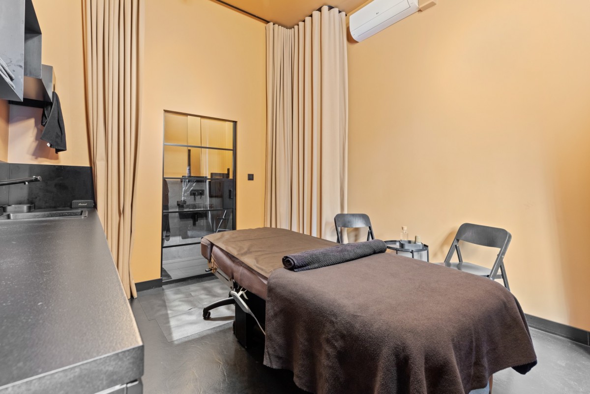 Pomieszczenie główne z dużym oknem i miejscem na stanowisko masażu oraz recepcję. Łazienka z prysznicem w eleganckim wykończeniu, w tonacji ciemnych płytek. Bardzo dobry standard wykończenia, oświetlenie dopasowane do funkcji relaksacyjnych i usługowych.