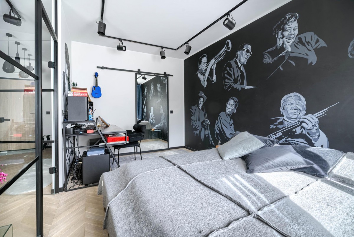 Na jednej ze ścian znajdują się ręcznie malowane portrety muzyków, które nadają wnętrzu artystyczny, niepowtarzalny klimat.