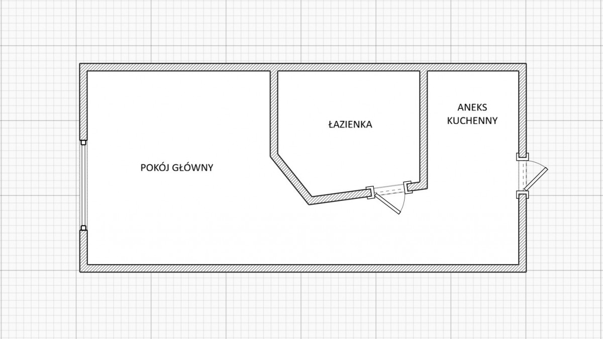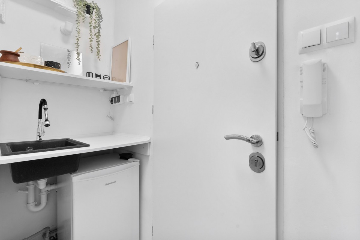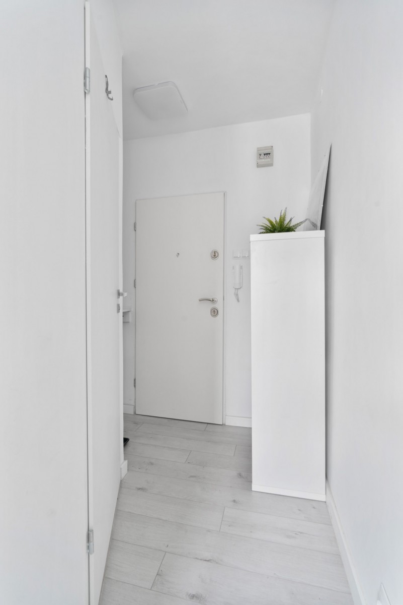 Układ: otwarta przestrzeń z aneksem, zaaranżowana jako samowystarczalna mikrokawalerka. Wnętrze jest jasne, ustawne i maksymalnie wykorzystuje dostępny metraż.
