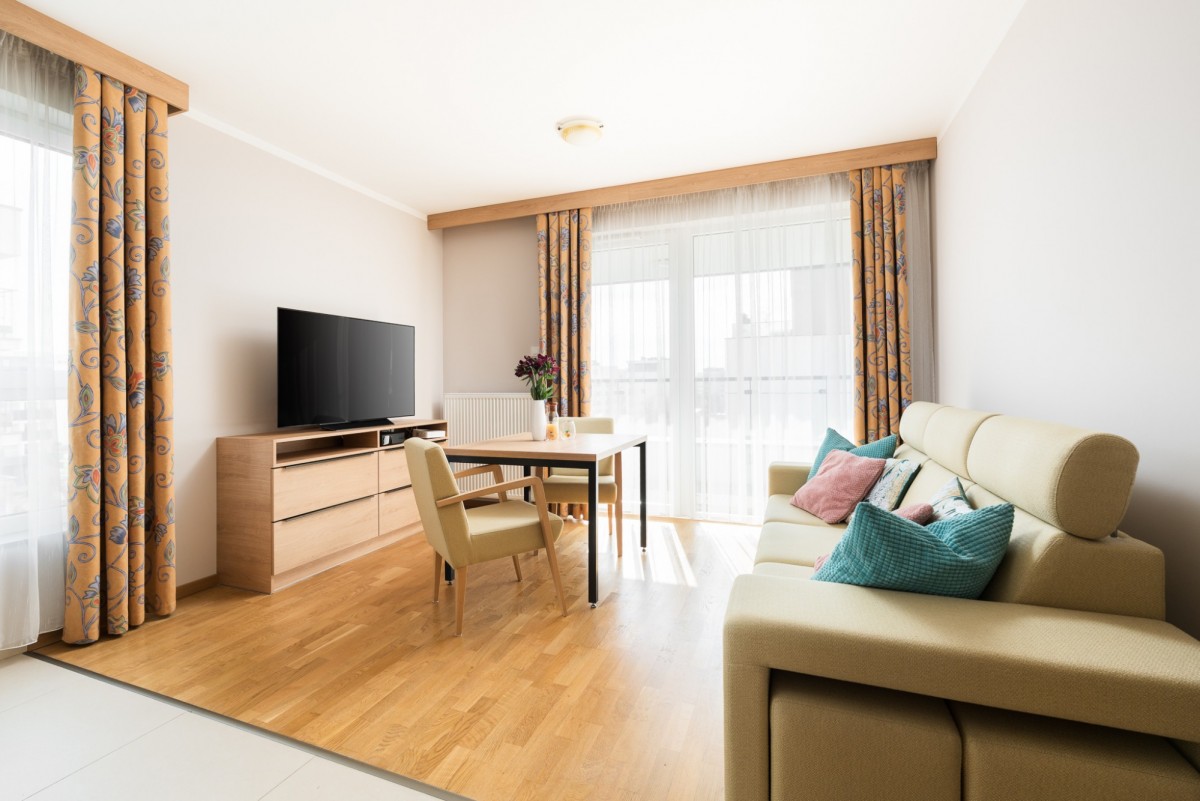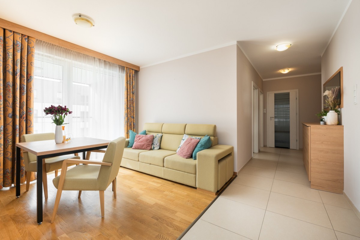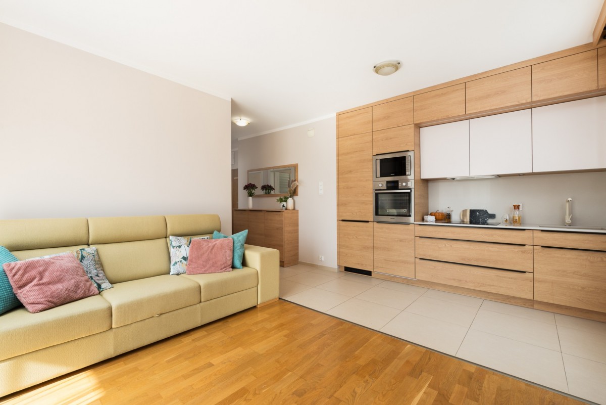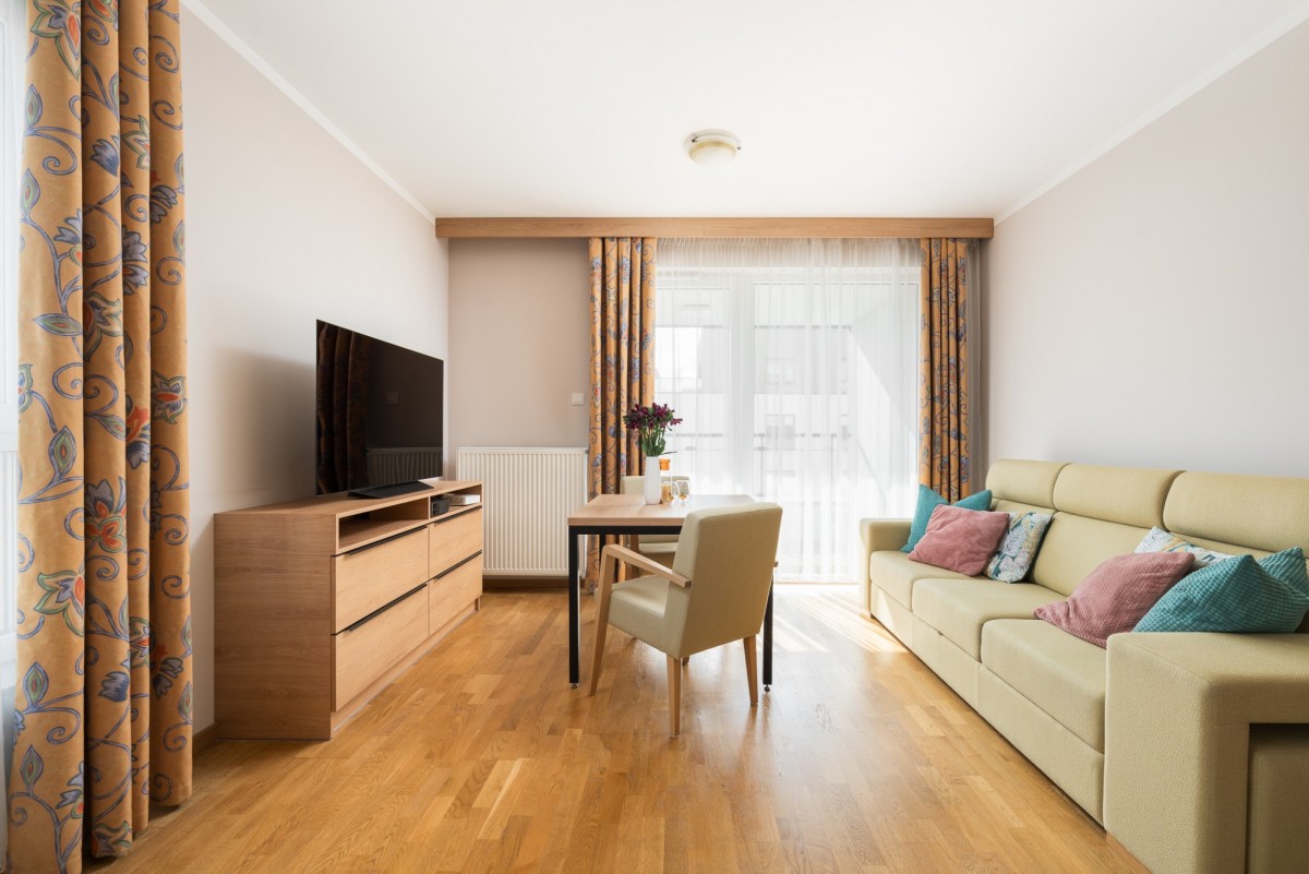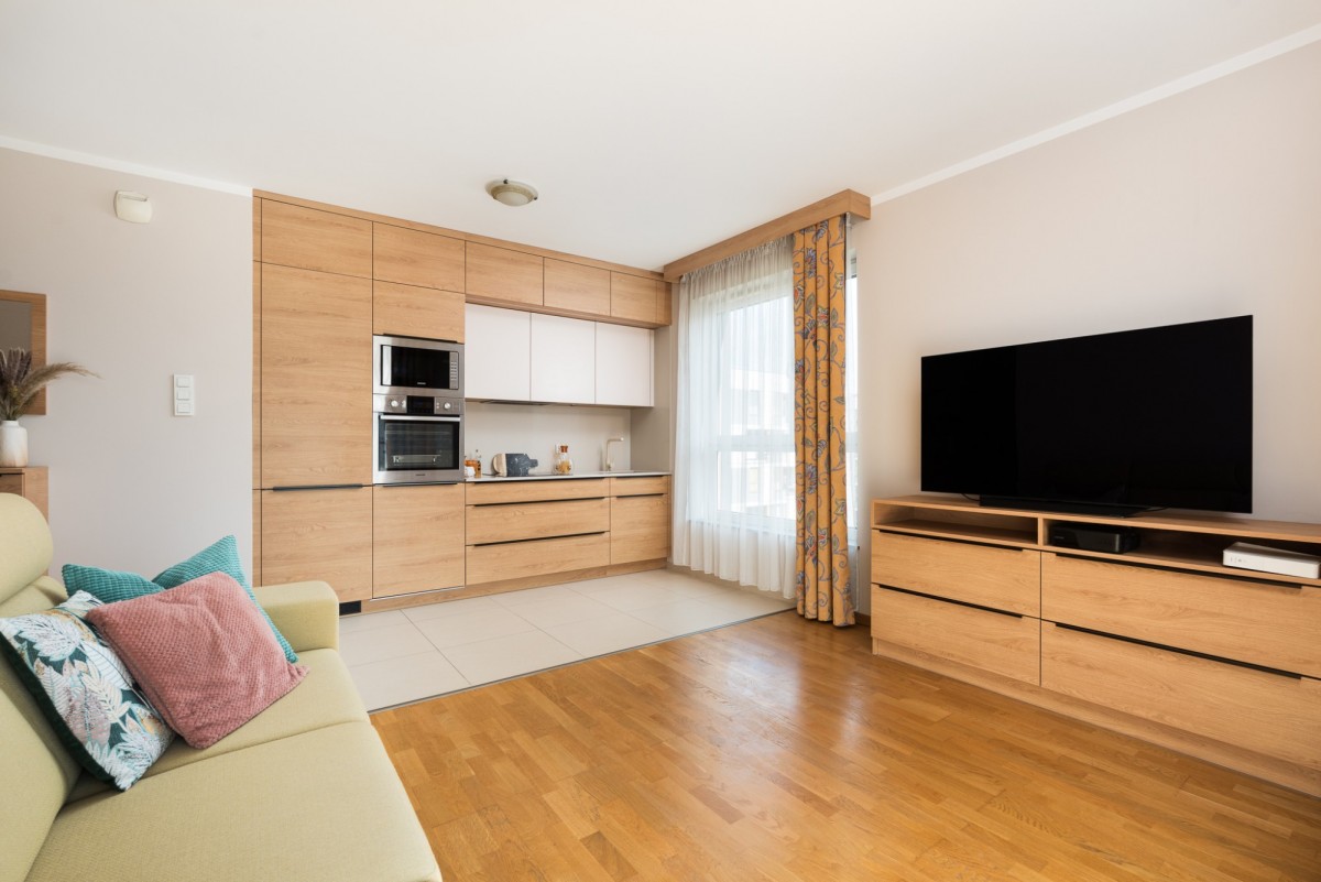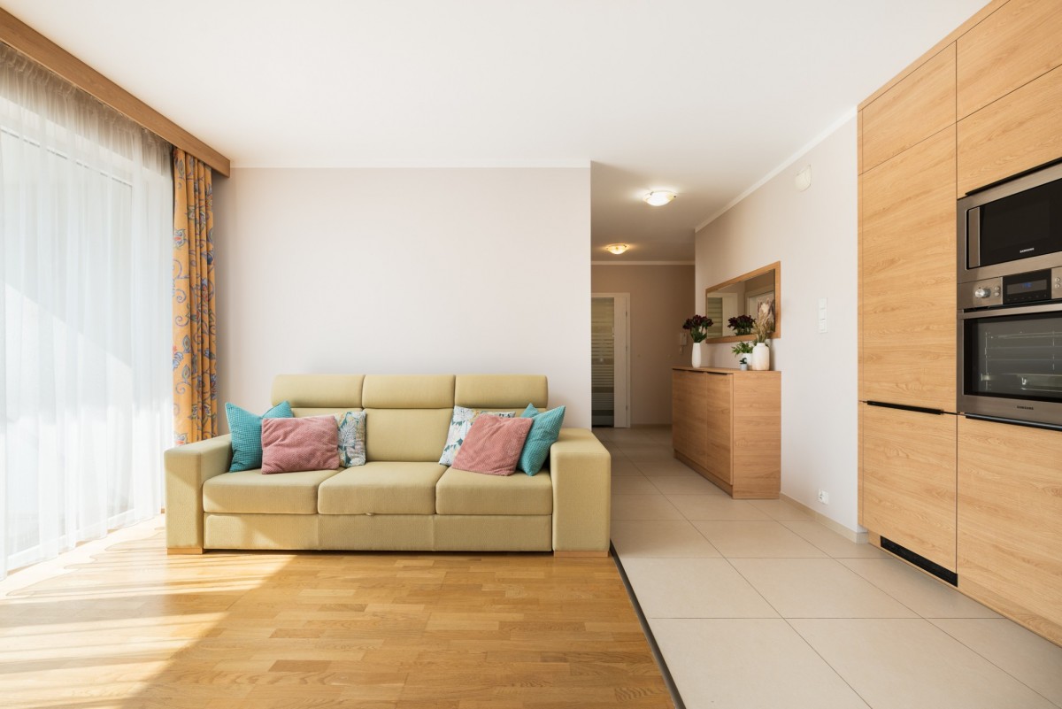 • salon z aneksem kuchennym i wyjściem na przestronny balkon