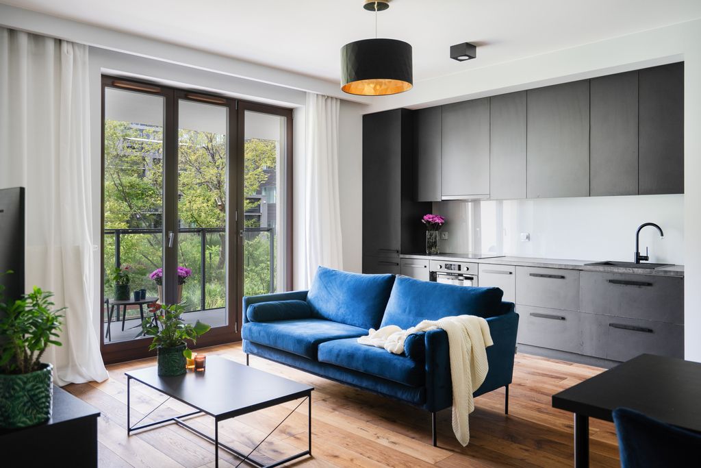 Wykończone i umeblowane mieszkanie jest dostępne i gotowe do wprowadzenia. Funkcjonalny aneks kuchenny otwarty na salon tworzy duży i wygodny pokój dzienny. Ciemna kolorystyka mebli w połączeniu ze słoneczną stroną świata sprawia, że mieszkanie wygląda jasno i gustownie. Sypialnia z wielkimi oknami wielkości drzwi balkonowych i widokiem na drzewa stwarza poczucie prywatności.