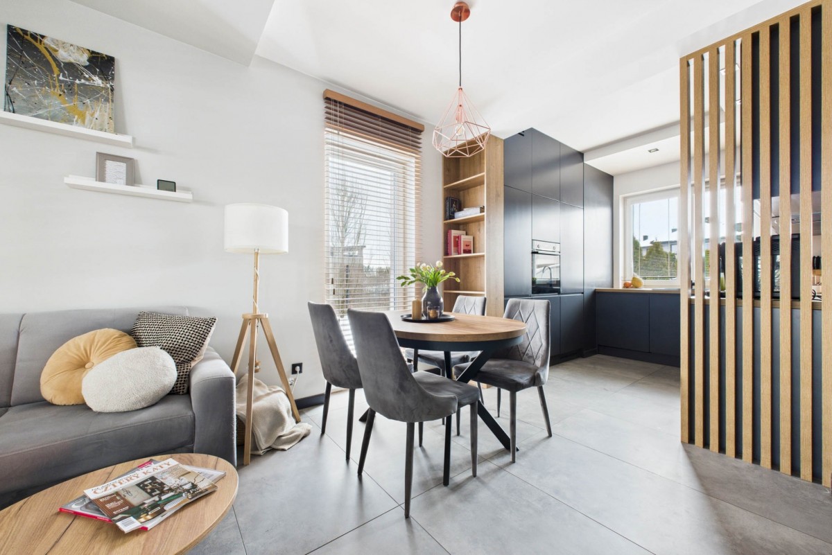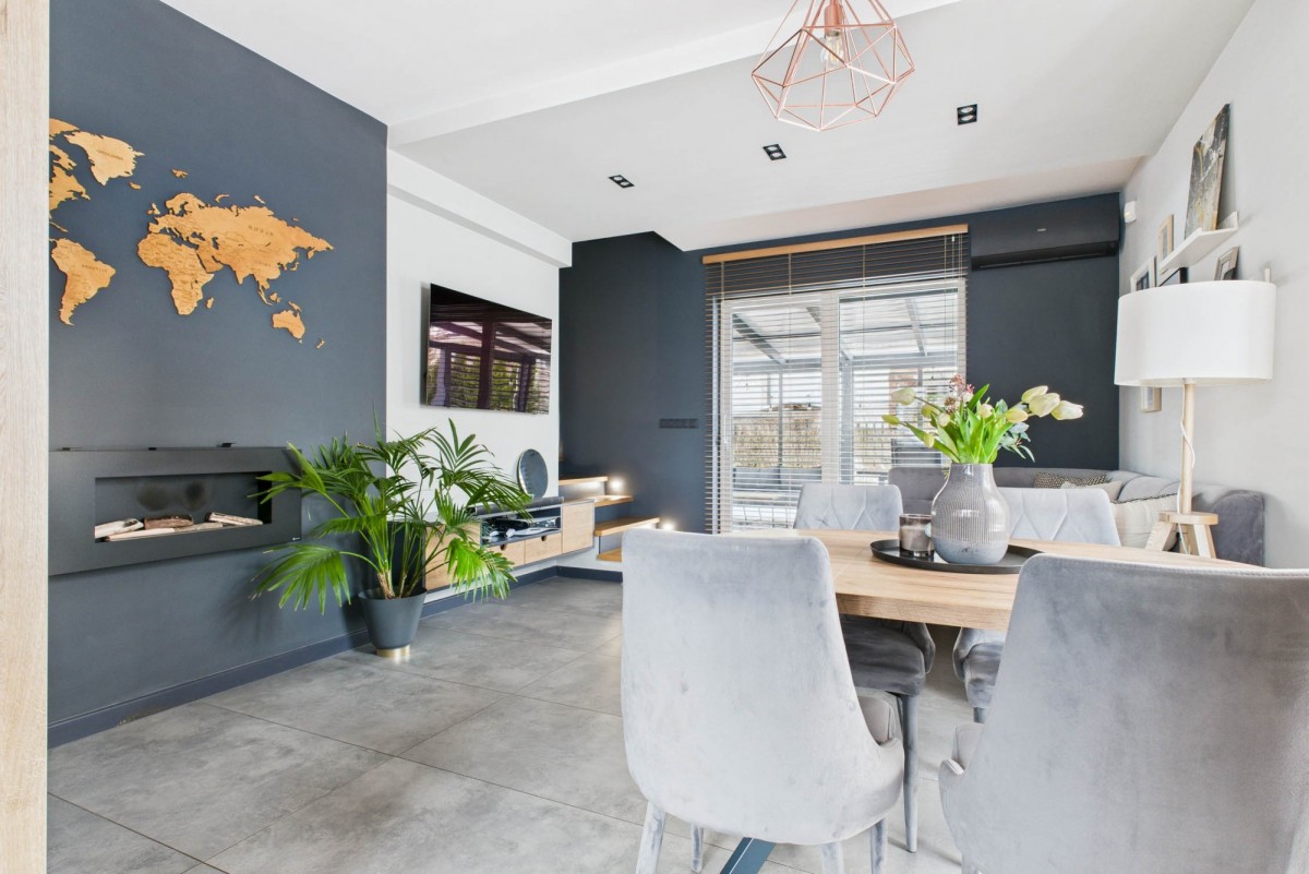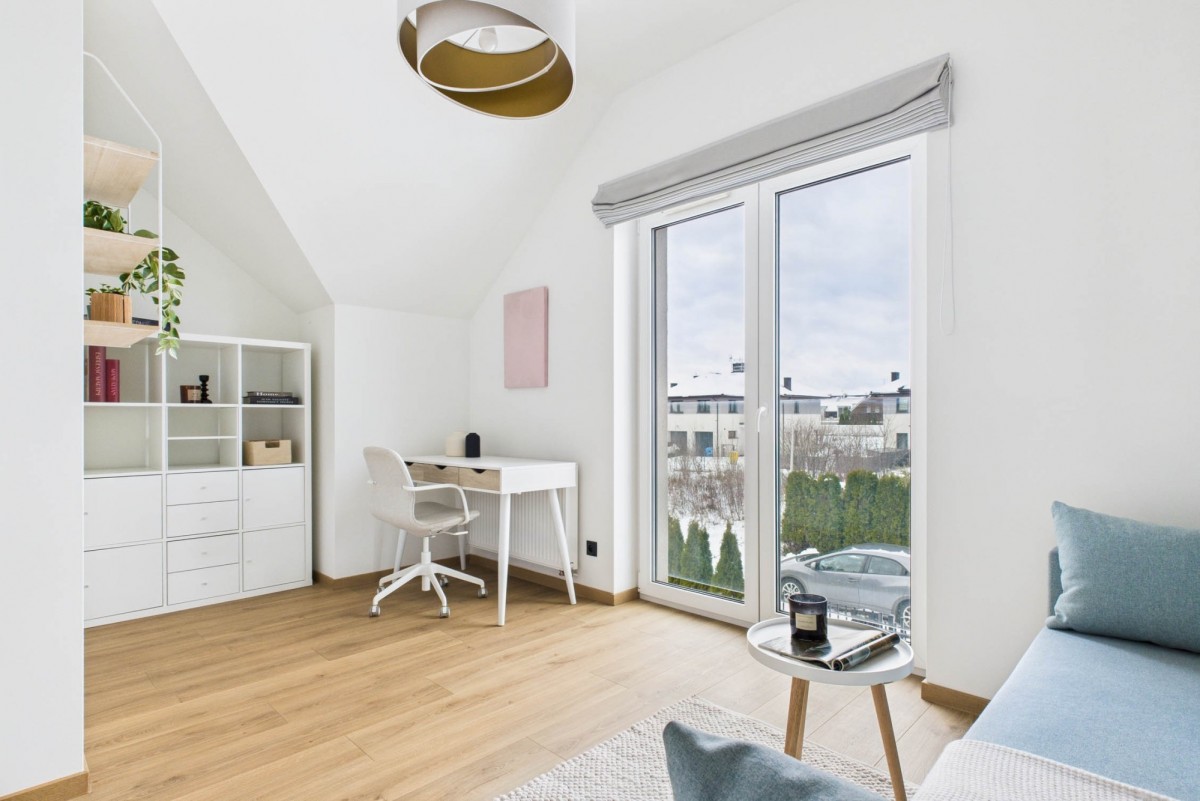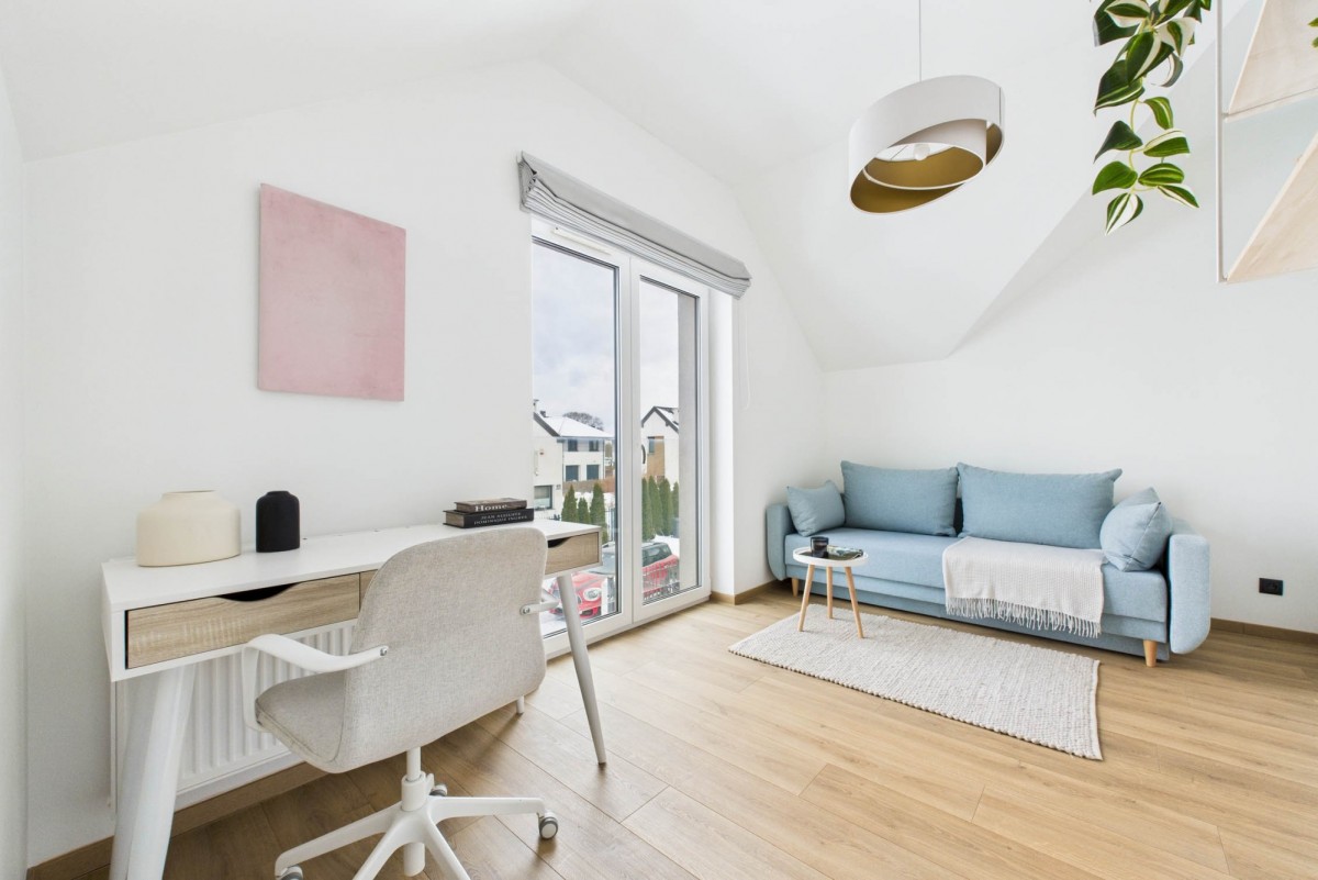 - przestronny salon z aneksem kuchennym oraz wyjściem do ogrodu
