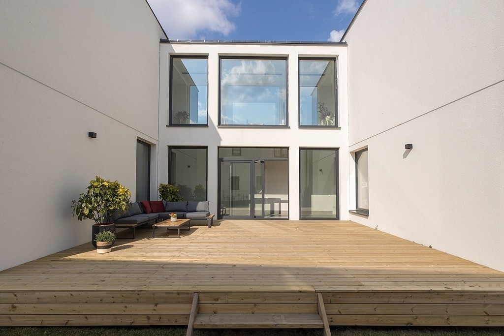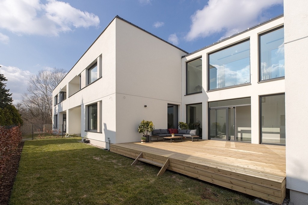 Dopełnieniem całości jest duży, drewniany taras, który tworzy luksusową strefę relaksu pod gołym niebem i przyjazną, integrującą atmosferę, przypominając klimatyczne, prywatne patio.
