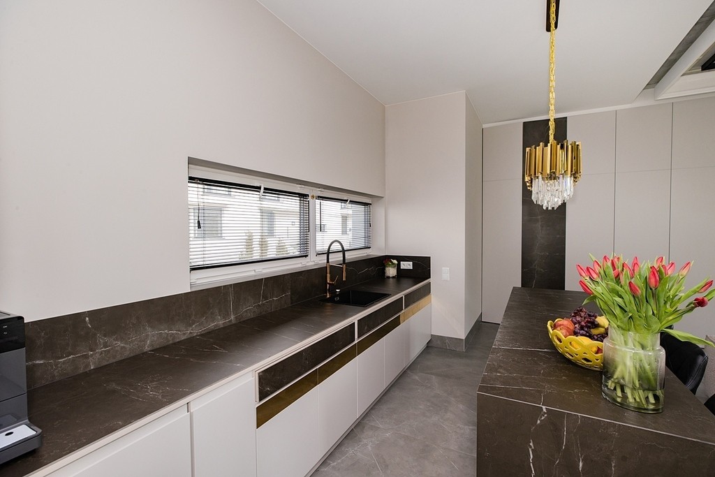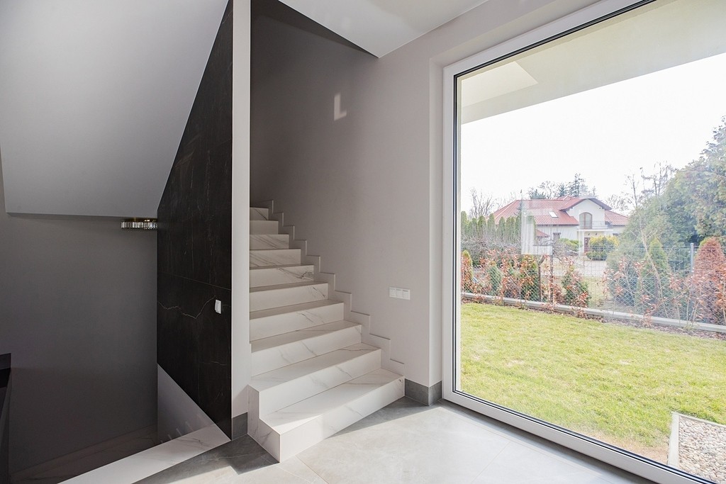 Dom wyróżniają panoramiczne okna, które wpuszczają dużo naturalnego światła przez cały dzień. Granica między salonem a ogrodem praktycznie znika, a jasna kolorystyka wnętrz oraz wysokie sufity dają poczucie przestrzeni i luksusu.
