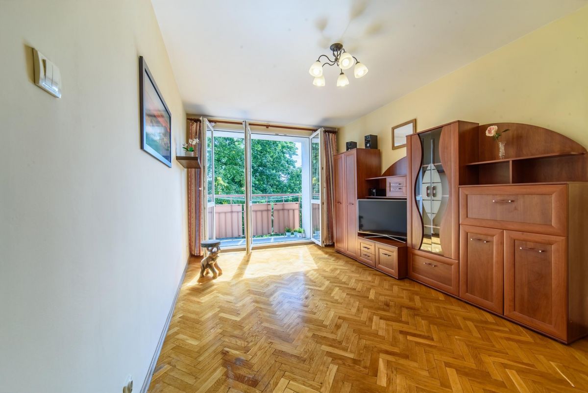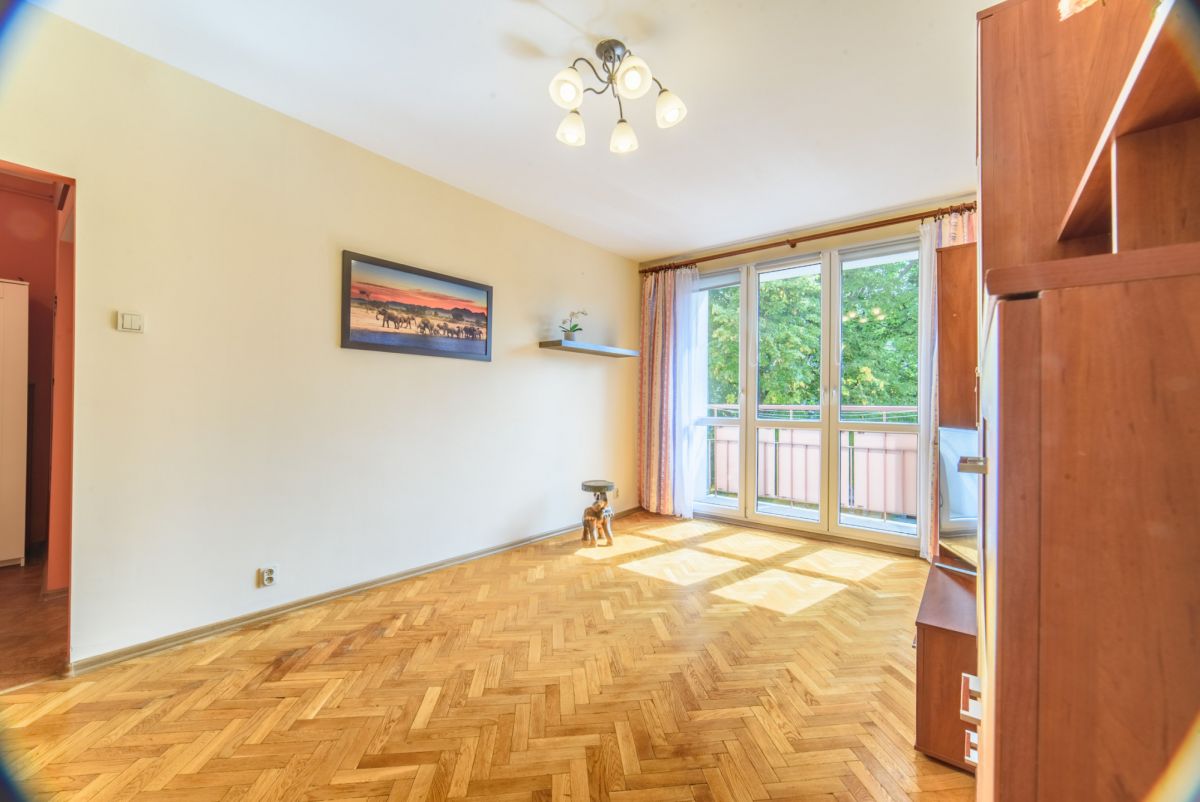 Pokój (18,5m2) z wyjściem na balkon. Trzy skrzydłowe okno, na podłodze ładny parkiet dębowy.