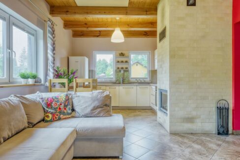 - Przestronnego salonu z kuchnią i jadalnią – otwarta, funkcjonalna przestrzeń z wyjściem na ogród,