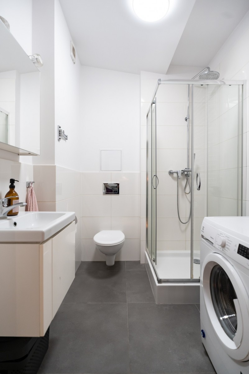 Lokal składa się z pokoju z aneksem kuchennym oraz łazienki. Kuchnia jest w pełni wyposażona, w przedpokoju znajduje się szafa wnękowa. Układ mieszkania jest prosty i funkcjonalny, dobrze sprawdzi się zarówno do zamieszkania, jak i pod wynajem.