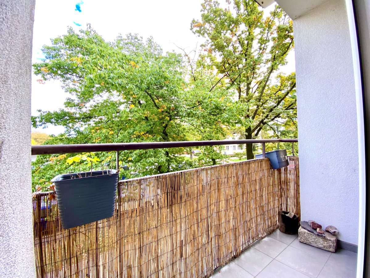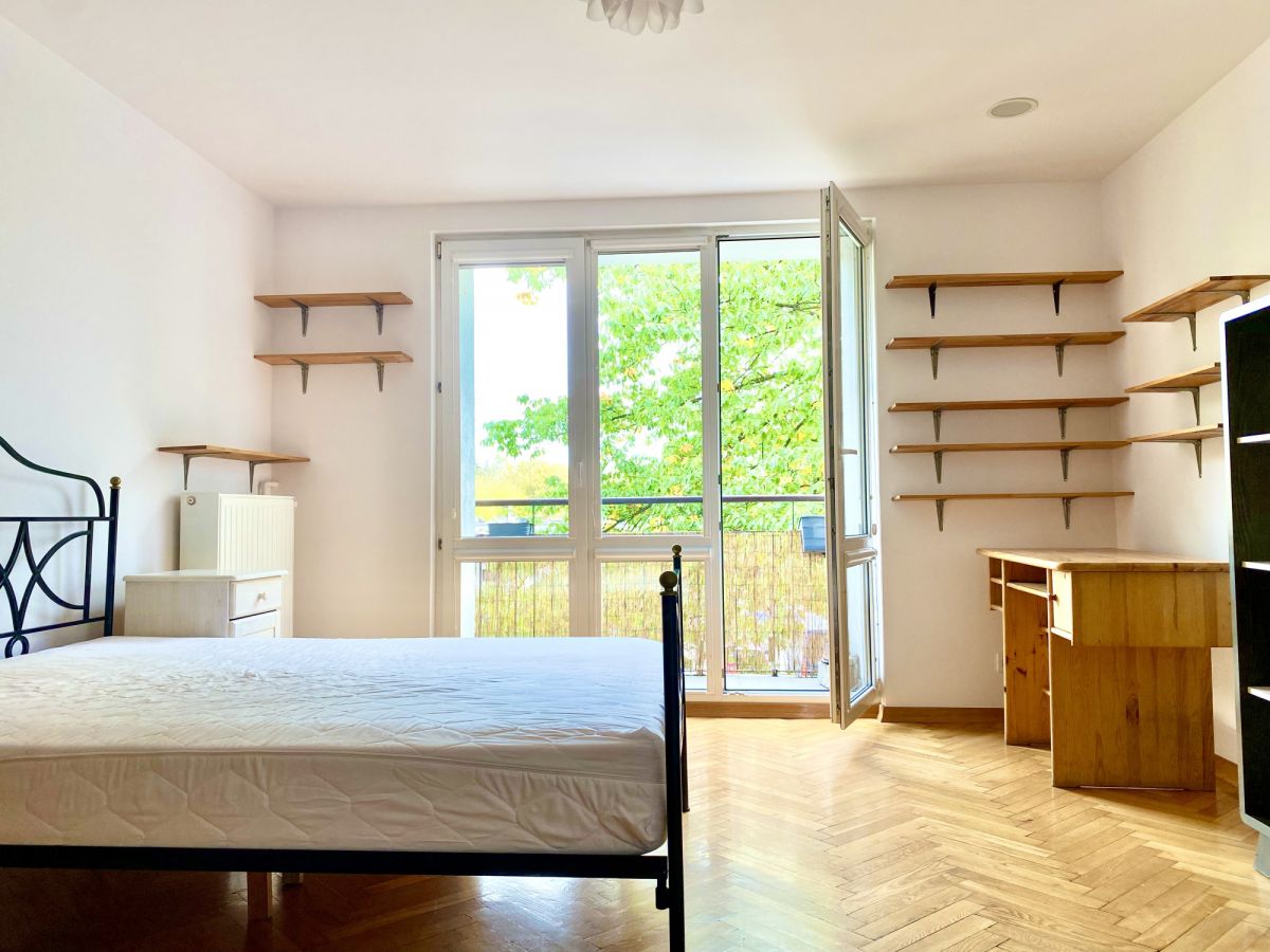 – Duży, jasny pokój z wyjściem na balkon z widokiem na starodrzewi.