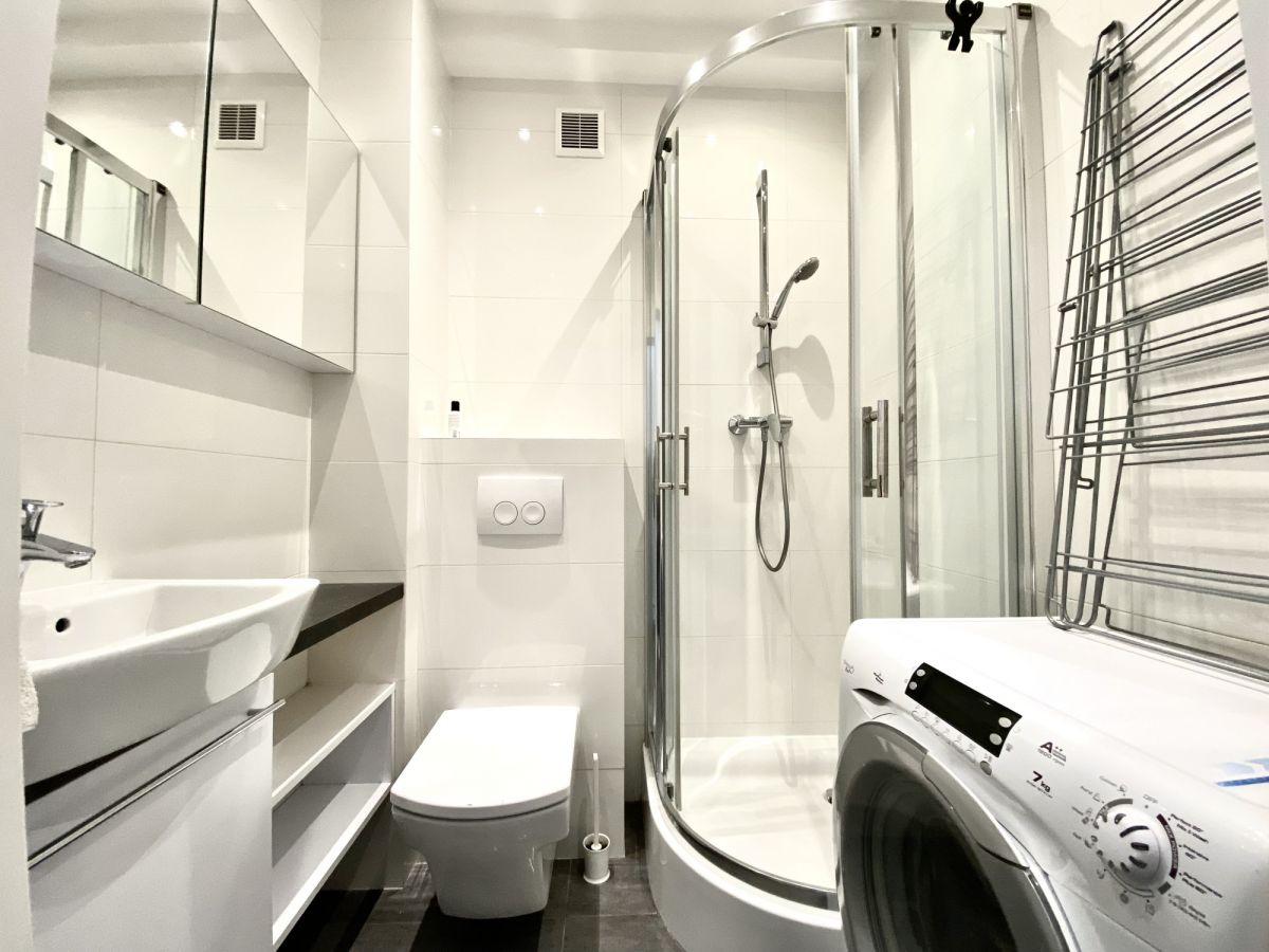 – Łazienka z prysznicem oraz pralką.