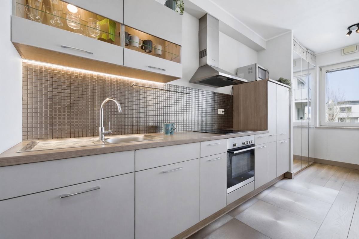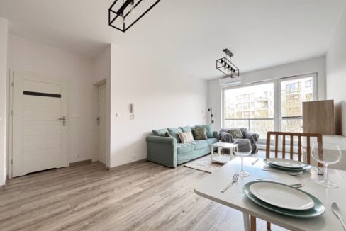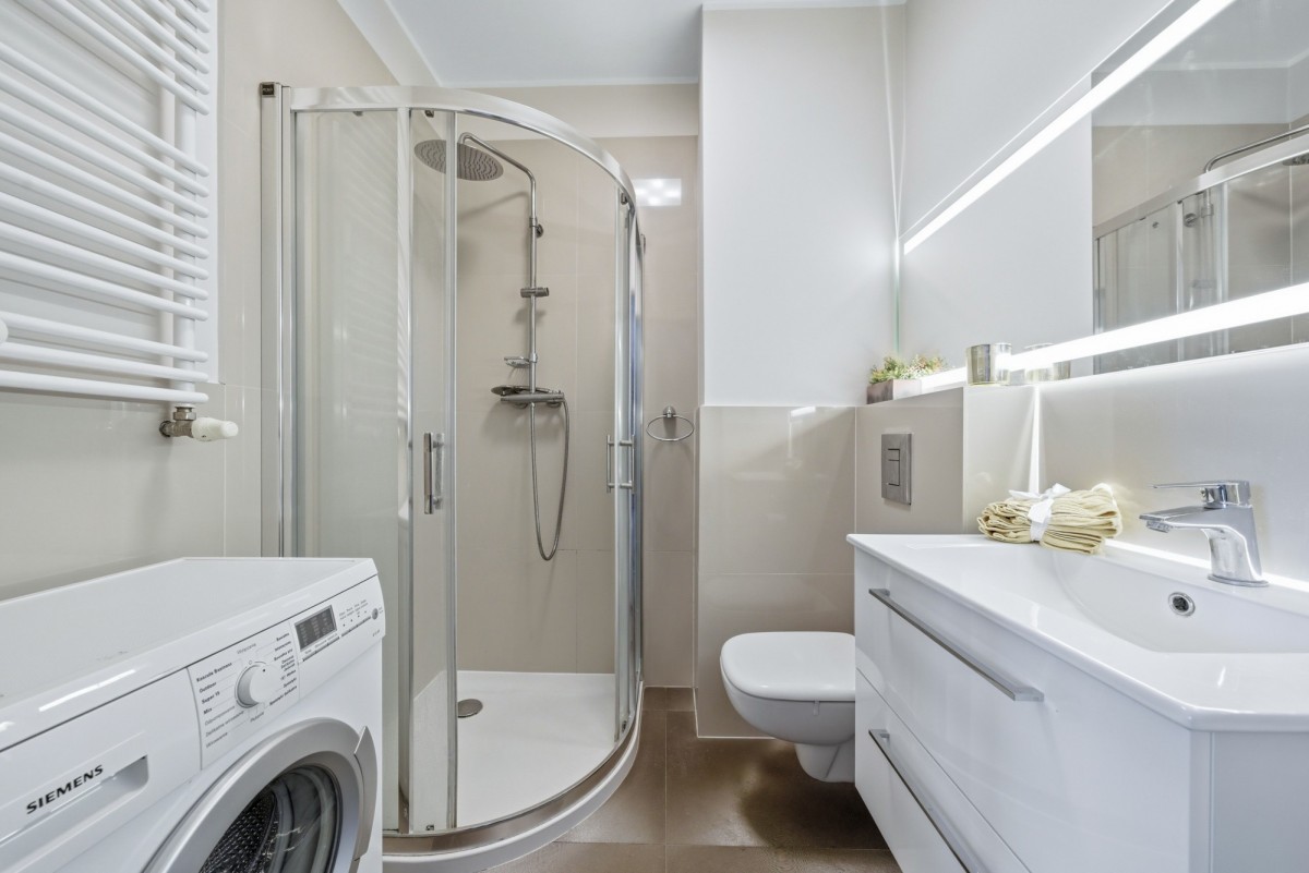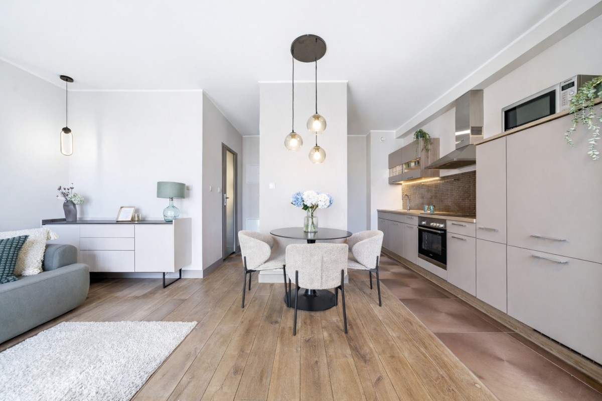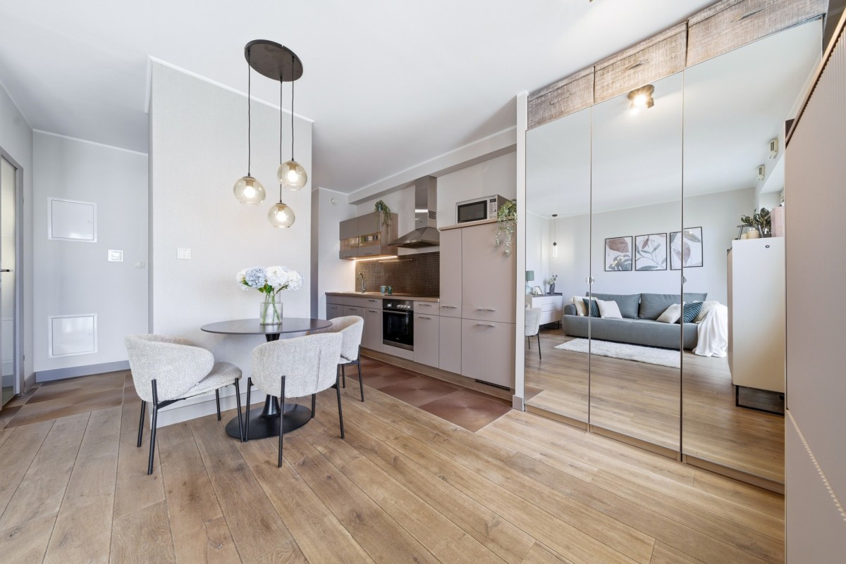 • Wyposażenie: lodówka, kuchenka, piekarnik, pralka, pojemne szafy