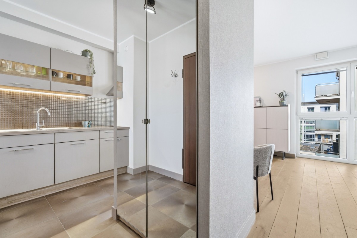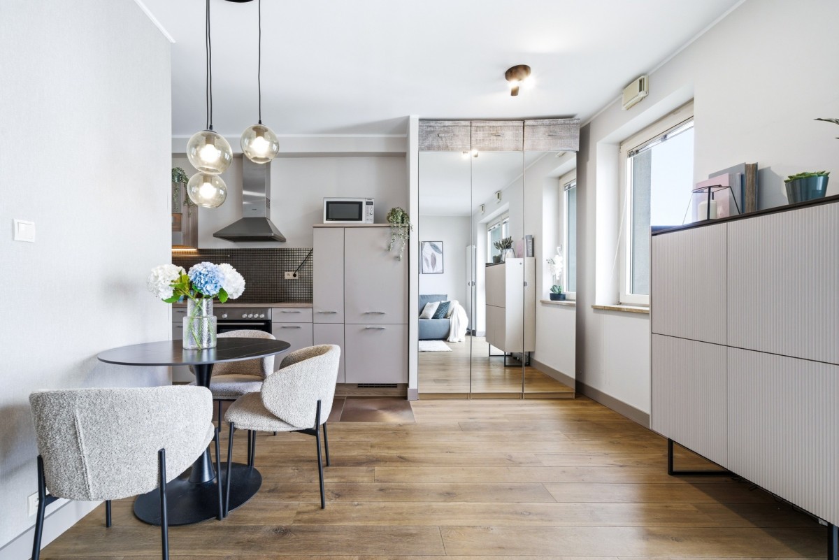 • Układ: przestronny pokój z aneksem kuchennym, łazienka z prysznicem, hol