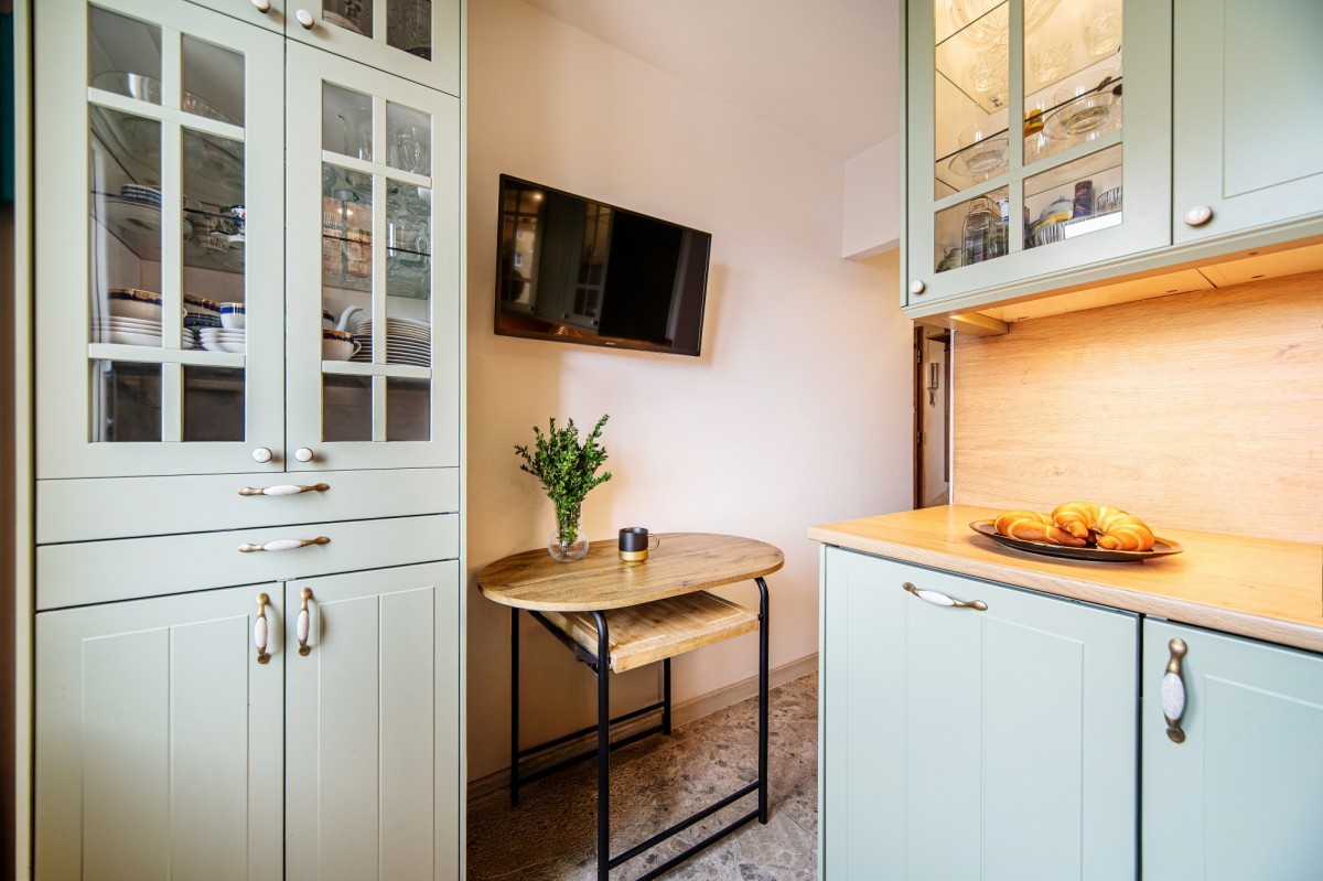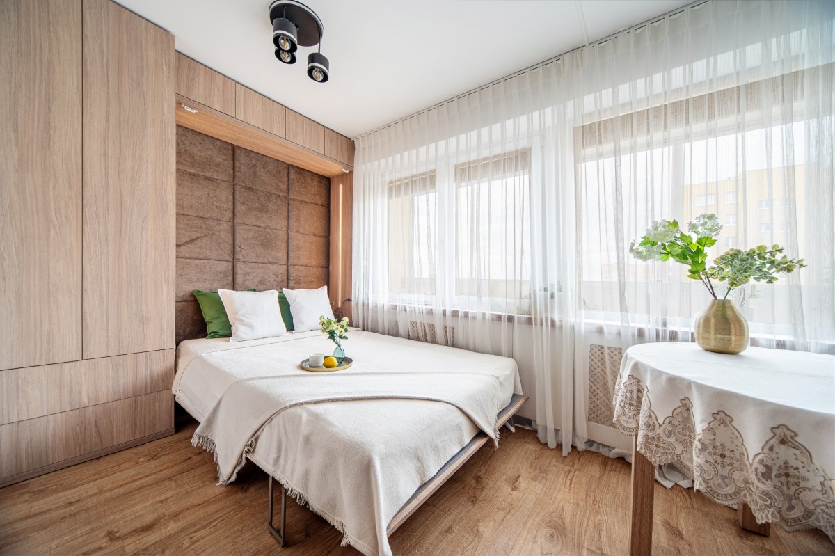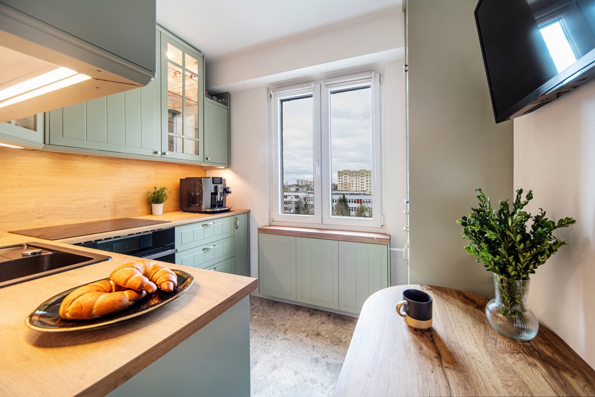 Przemyślany układ pomieszczeń obejmuje przestronny, jasny salon o powierzchni 21,7 m², który stanowi serce mieszkania, oraz oddzielną, elegancką kuchnię (6 m²) wyposażoną w wysokiej jakości meble wykonane na wymiar. Całość uzupełnia funkcjonalna łazienka oraz komfortowy przedpokój.
