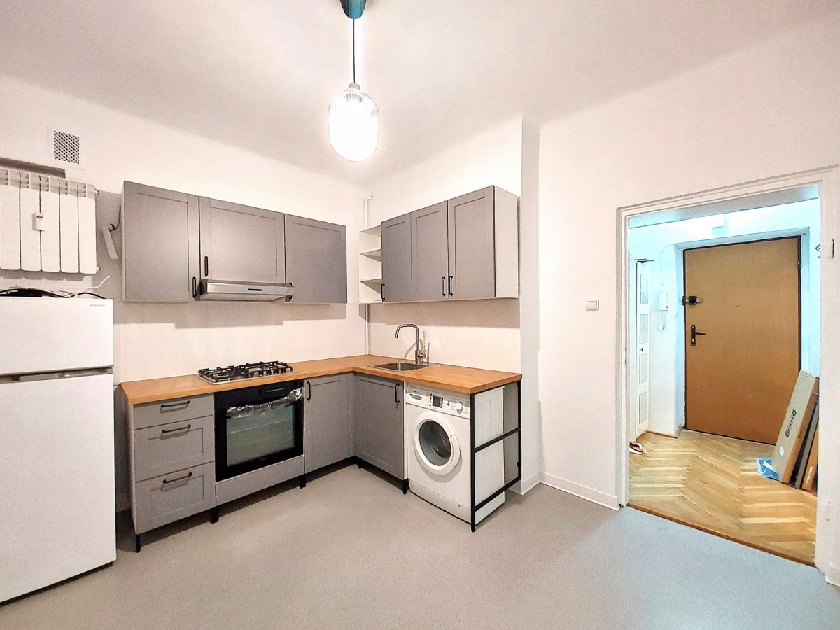 Kuchnia oddzielna 10m2 – lodówka, płyta gazowa, piekarnik w zabudowie, okap, pralka, stół + krzesła, liczne szafki.
