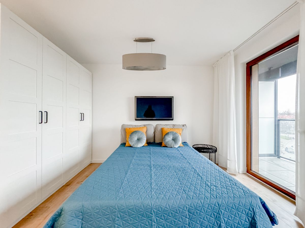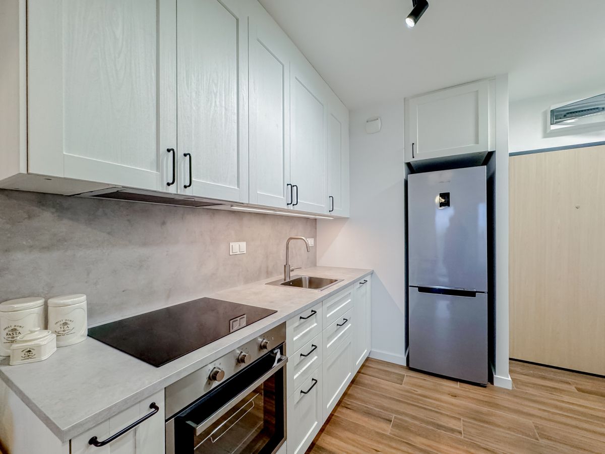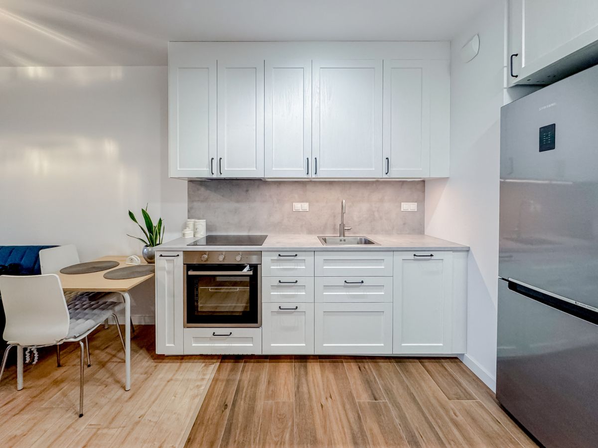 Mieszkanie zostało wykończone w spójnej, jasnej stylistyce. W salonie znajdują się: pojemna szafa, kanapa, łóżko oraz telewizor. Aneks kuchenny wyposażono w białe zabudowy do sufitu z oświetleniem LED oraz wysokiej jakości sprzęty AGD: piekarnik, zmywarkę, lodówkę wolnostojącą i okap. W łazience zastosowano podobną elegancką kolorystykę.