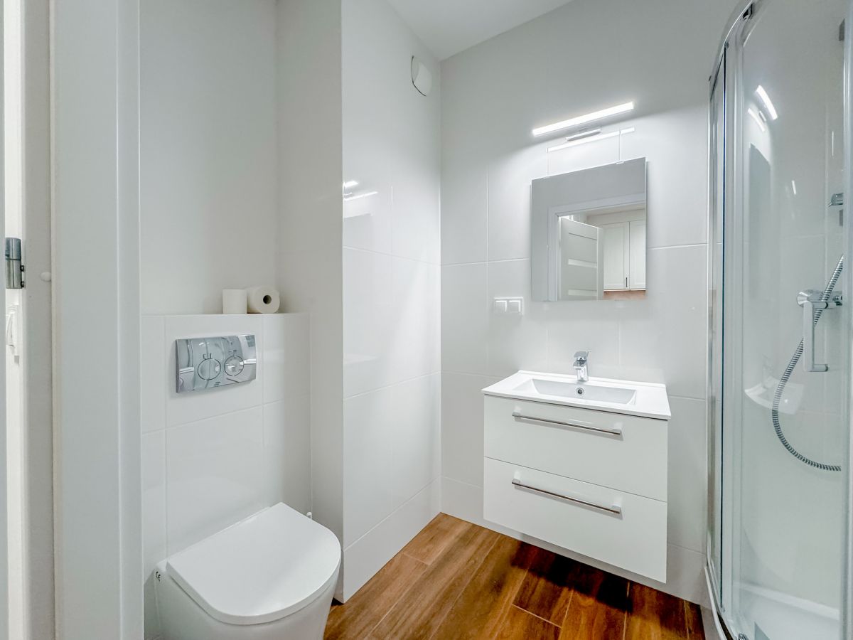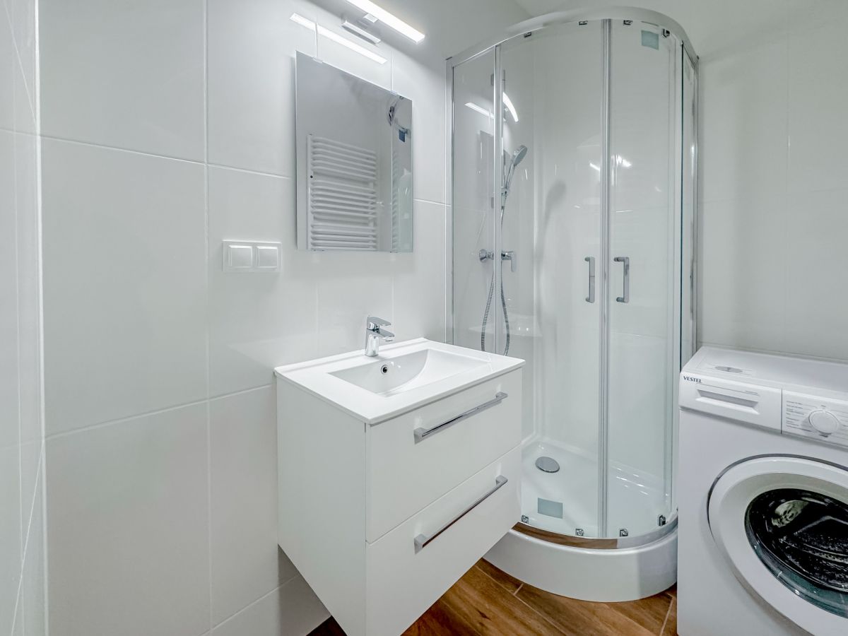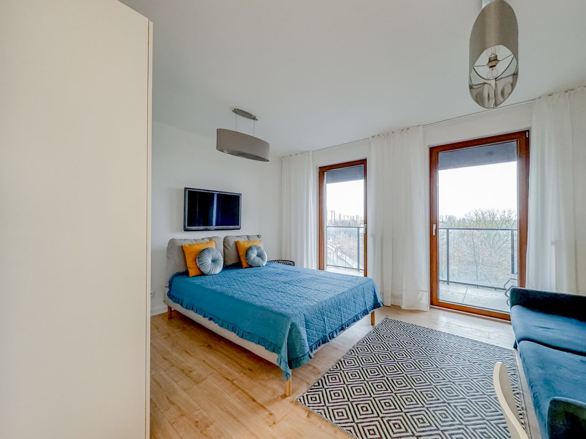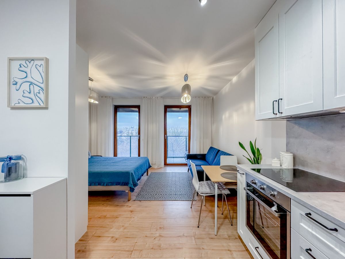 Mieszkanie zostało wykończone w spójnej, jasnej stylistyce. W salonie znajdują się: pojemna szafa, kanapa, łóżko oraz telewizor. Aneks kuchenny wyposażono w białe zabudowy do sufitu z oświetleniem LED oraz wysokiej jakości sprzęty AGD: piekarnik, zmywarkę, lodówkę wolnostojącą i okap. W łazience zastosowano podobną elegancką kolorystykę.