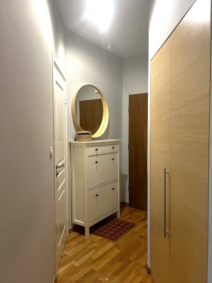 Wnętrze urządzone w spójnym, nowoczesnym stylu — ciepłe kolory, drewniana podłoga oraz przemyślane oświetlenie tworzą przytulną atmosferę. Mieszkanie jest zadbane i gotowe do wprowadzenia bez dodatkowych nakładów.