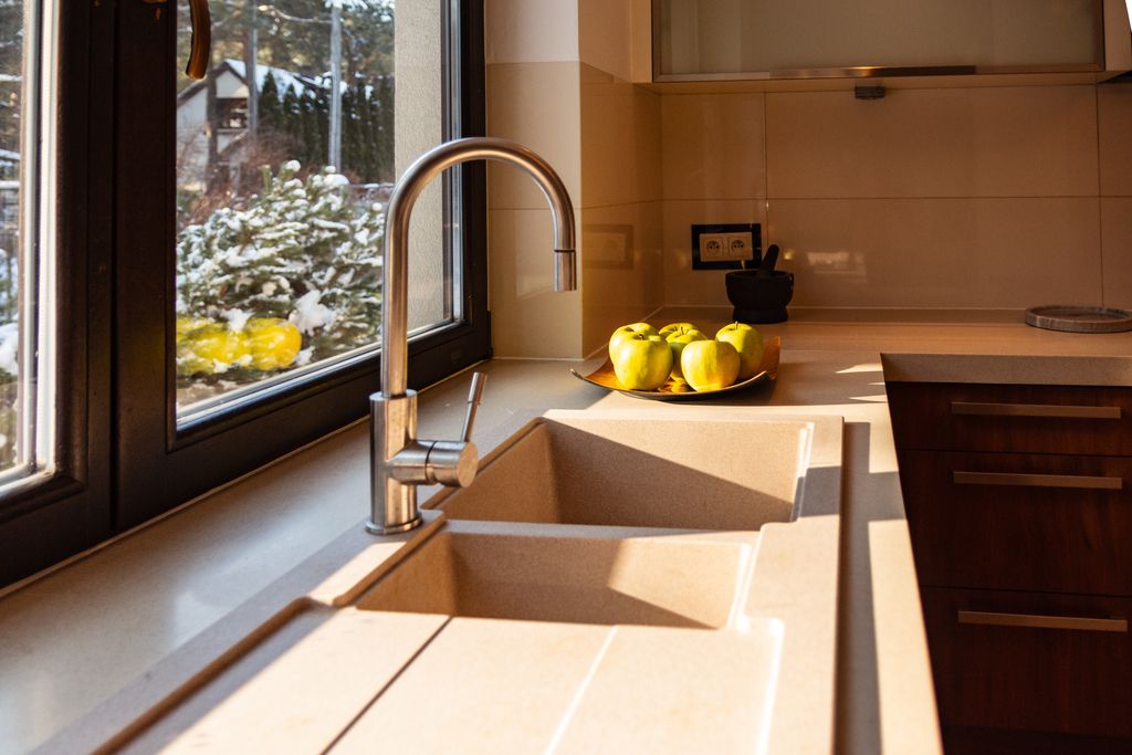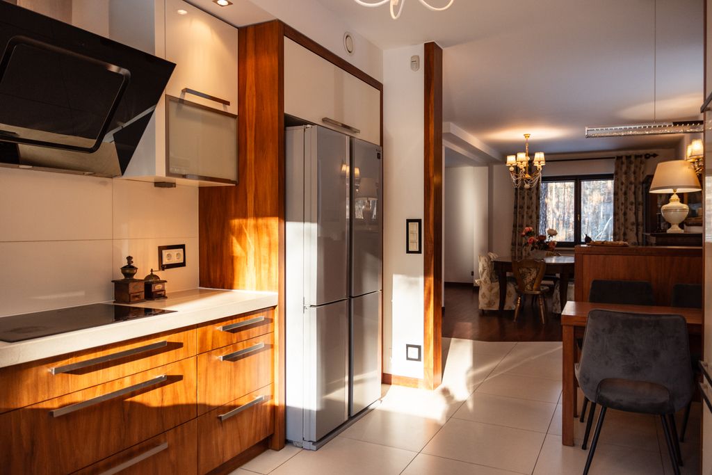 Okap kuchenny MAAN, Płyta indukcja AEG, meble kuchenne osprzęt blum, mikrofala i piekarnik BOSCH, lodówka inox – side by side SHARP, piec na gaz dwufunkcyjny z zamkniętą komorą spalania Vaillant. Własna woda ale można się podpiąć do miejskiej w każdej chwili.