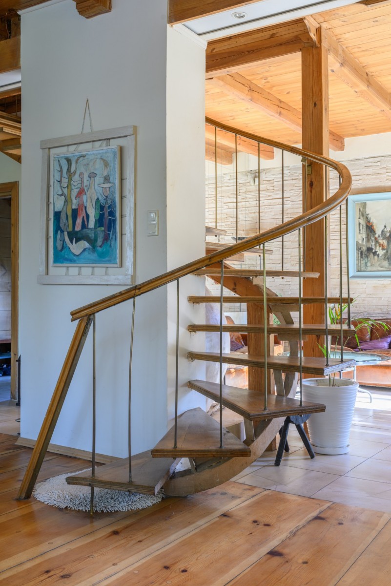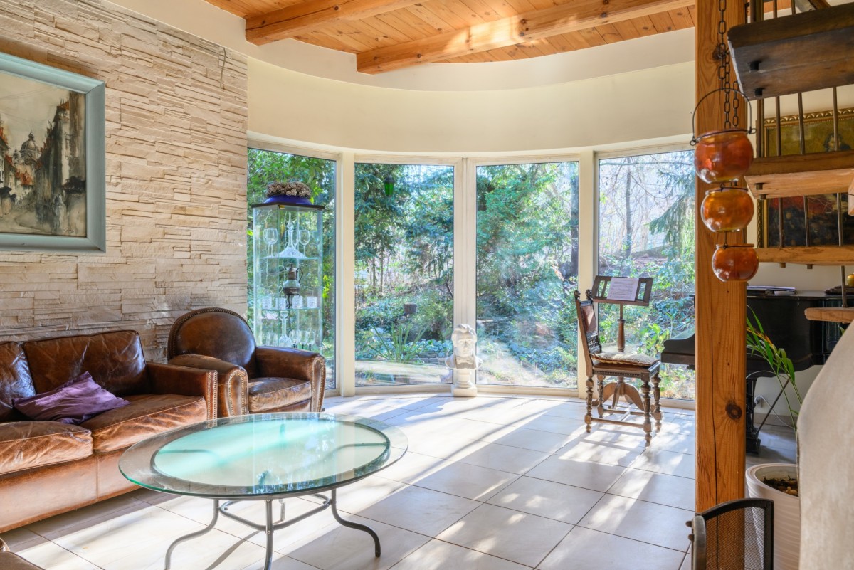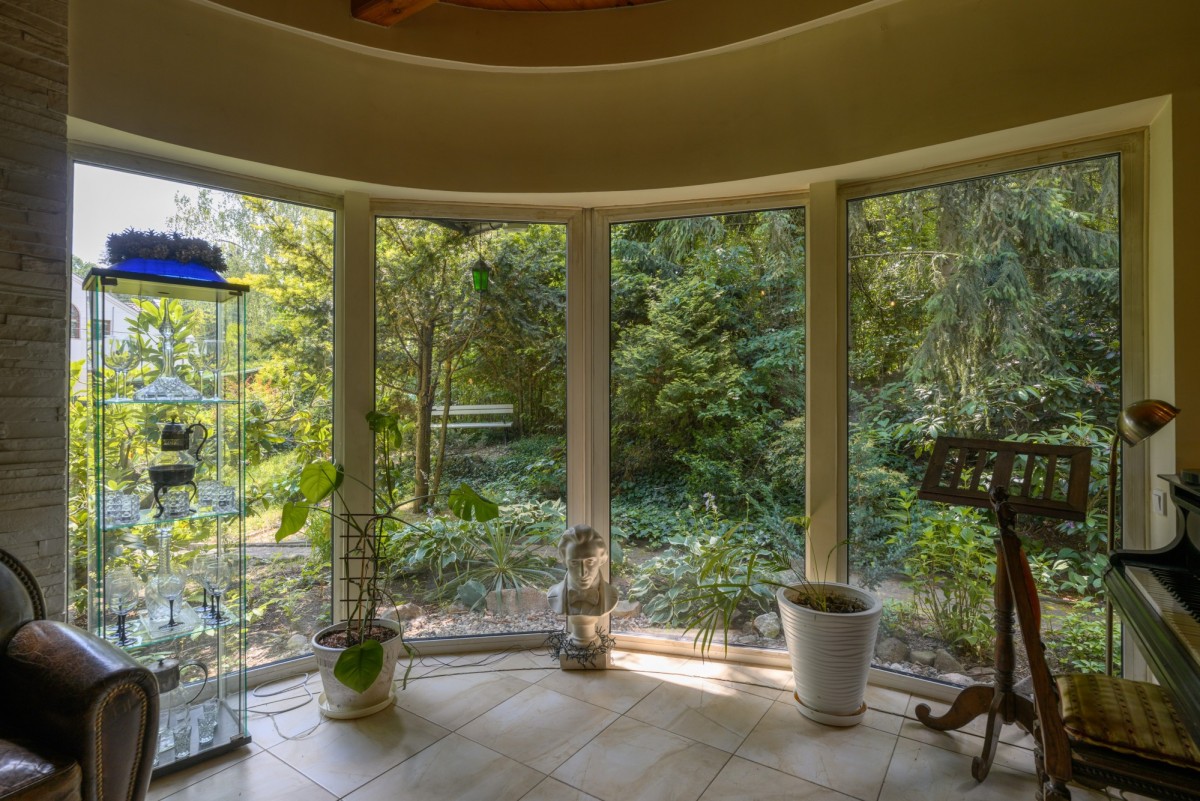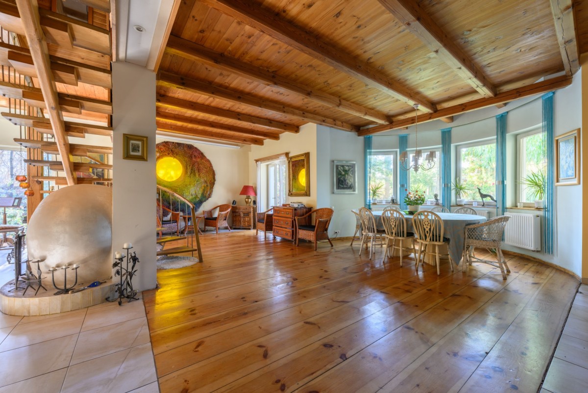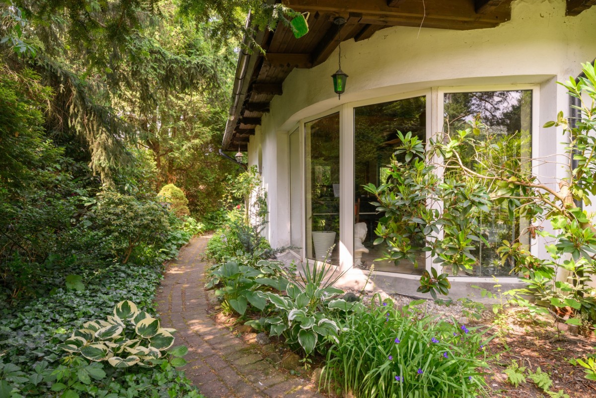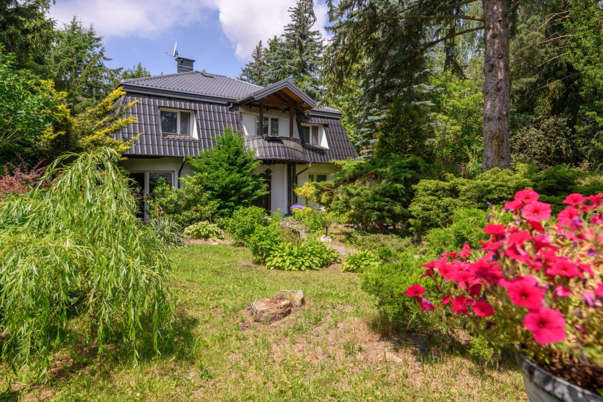 Dom jest otoczony zielenią. Bardzo duży ogród ze starodrzewiem oraz licznymi nasadzeniami zapewnia prywatność i wyjątkowo przyjemną przestrzeń do spędzania czasu na zewnątrz. Zieleń otaczająca dom zagląda do wnętrz i tworzy poczucie bezpośredniego kontaktu z sąsiadującą naturą, atrakcyjną o każdej porze roku. Na terenie działki znajduje się także klimatyczne oczko wodne, taras oraz drewutnia.