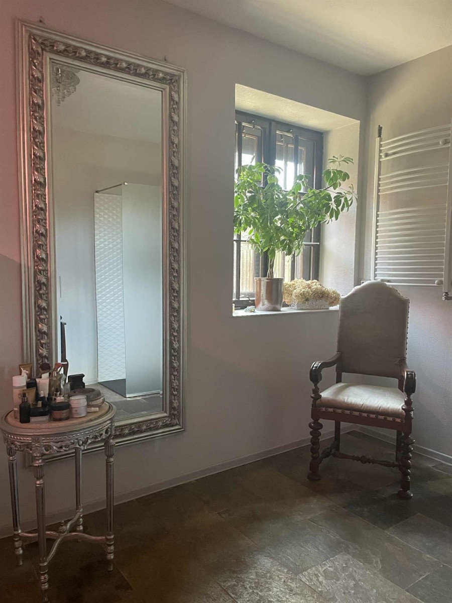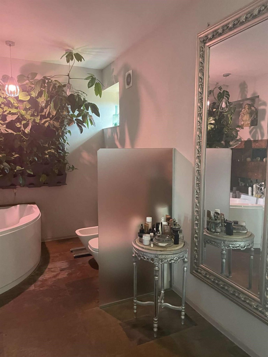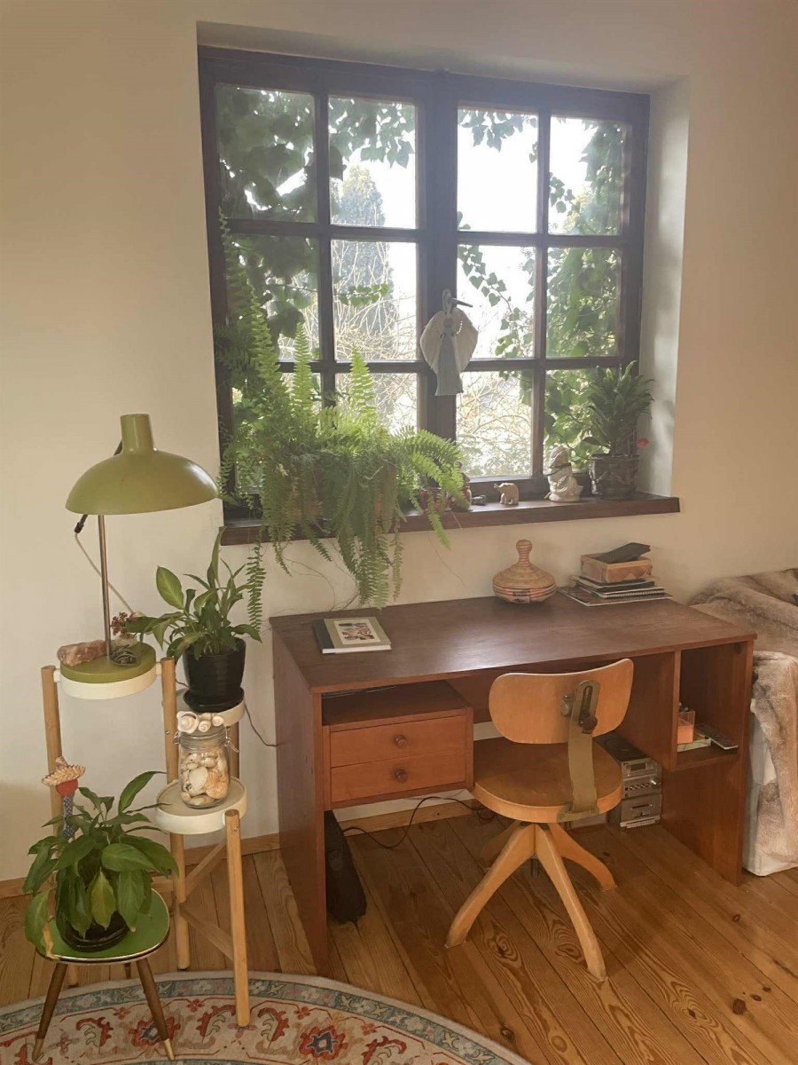 W najstarszej części domu jest przestronna komunikacja, kuchnia z jadalnią o łącznej powierzchni około 32 m2,łazienka 14,3m2 i salon około 42m2 z dużymi oknami (jedno z roletą zewnętrzną), z możliwością wyjścia na 2 tarasy i do ogrodu. Na piętrze są 2 pokoje, każde z wyjściem na loggię,1 sypialnia z wydzieloną garderobą i łazienka, a na poddaszu otwarta, dobrze oświetlona przestrzeń wypoczynkowa i garderoba.