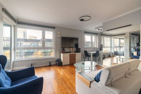 Mieszkanie wyróżnia się idealnym układem pomieszczeń, zapewniającym wygodę i funkcjonalność na co dzień. Składa się z przestronnego salonu oraz oddzielnej kuchni, oddzielonej od części dziennej lekką ścianką działową.