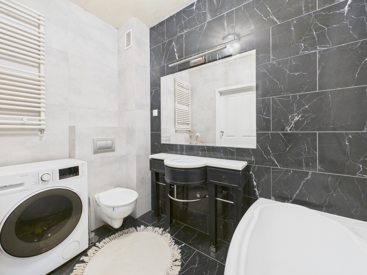 Do dyspozycji jest również duża sypialnia o powierzchni ponad 10 m² z dużym oknem, które doskonale doświetla wnętrze. Łazienka została wykończona w eleganckiej, nowoczesnej stylistyce – z wykorzystaniem czarnych i szarych płytek oraz wyposażona w wannę, która zapewnia komfort i relaks. W korytarzu przewidziano miejsce na obszerną szafę wnękową, gwarantującą dodatkową przestrzeń do przechowywania.