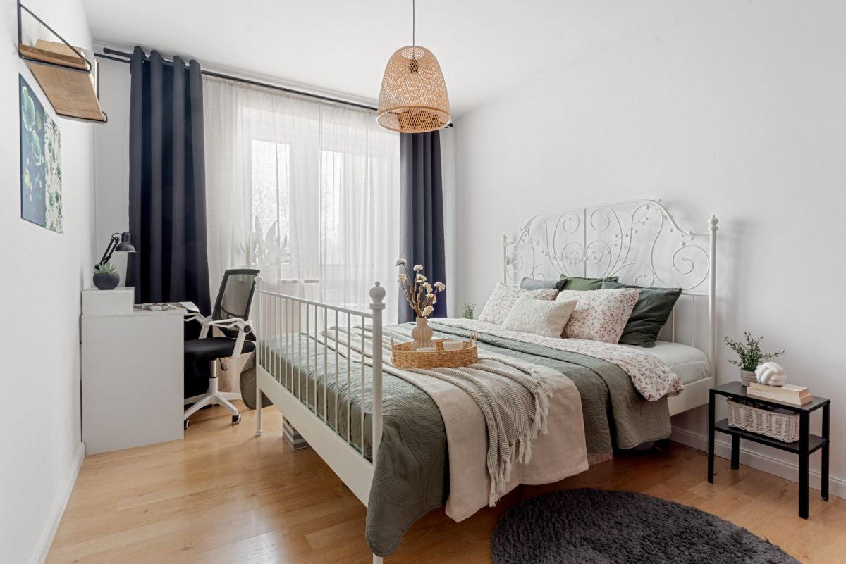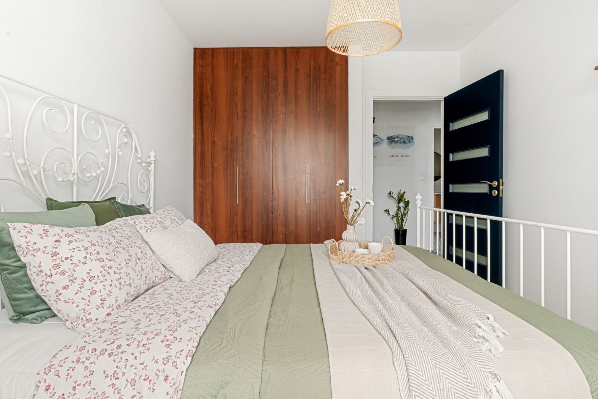 Nieruchomość posiada bardzo komfortowy układ funkcjonalny – sypialnie oddalone są od części dziennej, dzięki czemu dźwięki dobiegające z salonu i aneksu kuchennego są niemal niesłyszalne w sypialniach.