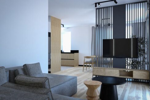 Na parterze znajduje się przestronny salon z wyjściem na taras, nowoczesna kuchnia wyposażona w wysokiej klasy sprzęty AGD oraz toaleta dla gości.