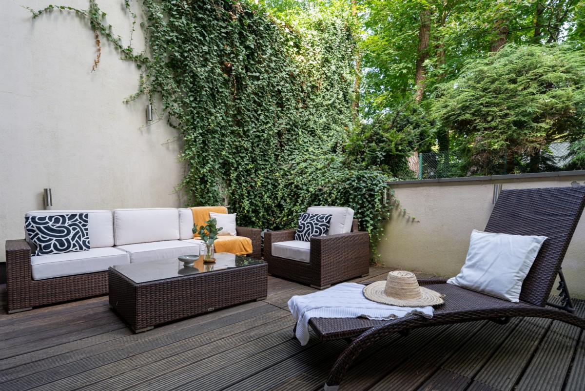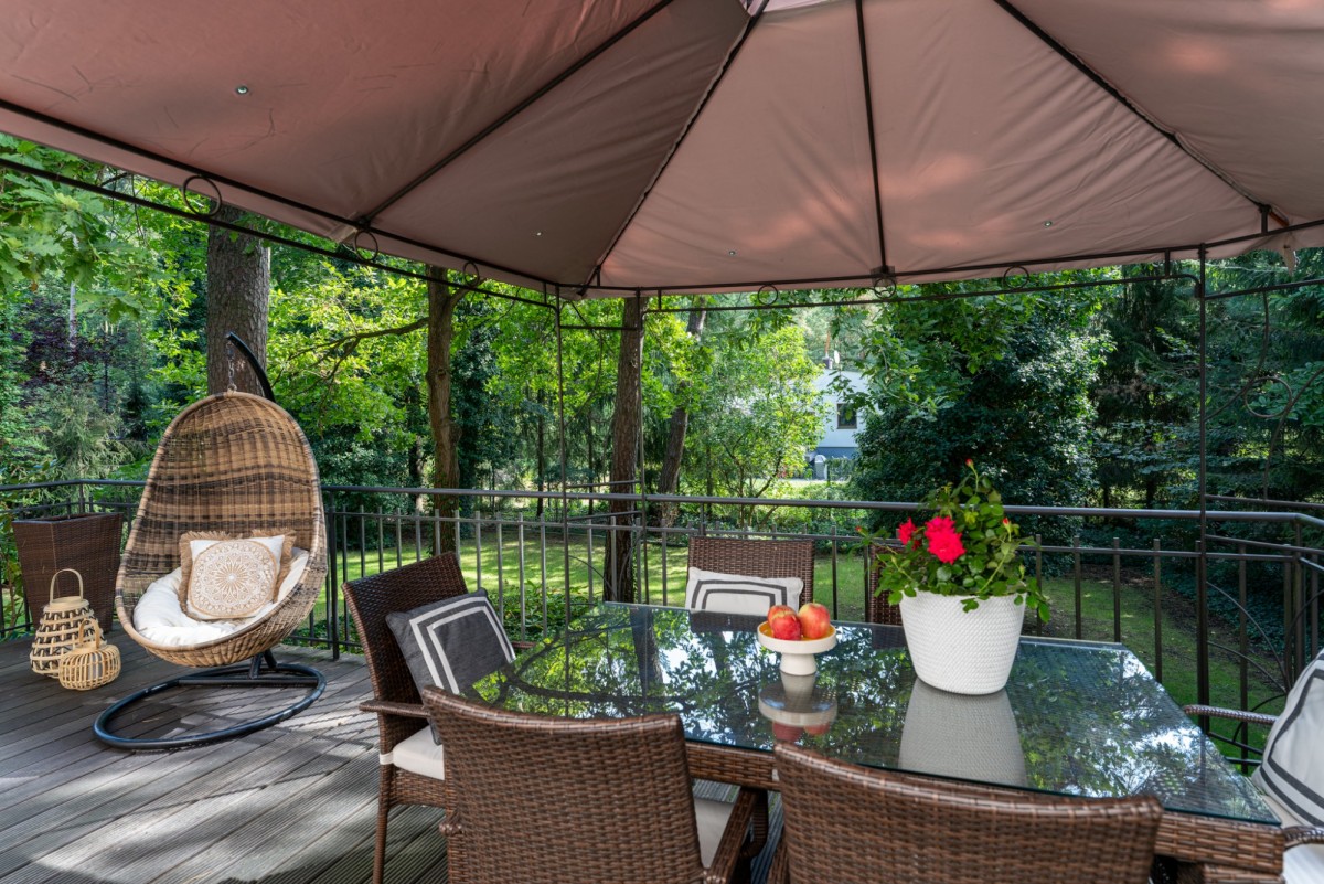 Do dyspozycji mieszkańców pozostaje także dwustanowiskowy garaż, na tarasach meble ogrodowe i grill (na tarasie wychodzącym z kuchni) oraz meble wypoczynkowe. Bezsprzecznym atutem jest także zachwycający, zadrzewiony ogród z automatycznym podlewaniem i studnią głębinową, który wraz z domem zajmuje aż 1600 m2 działkę. Rezydencja na wynajem posiada również domofon, alarm oraz monitoring dopełniające bezpieczeństwo i wygodę codziennego życia.