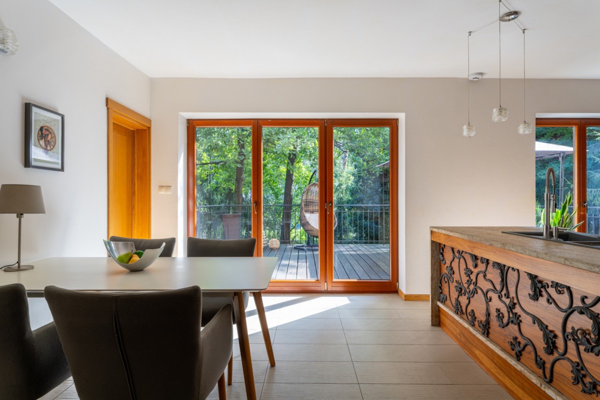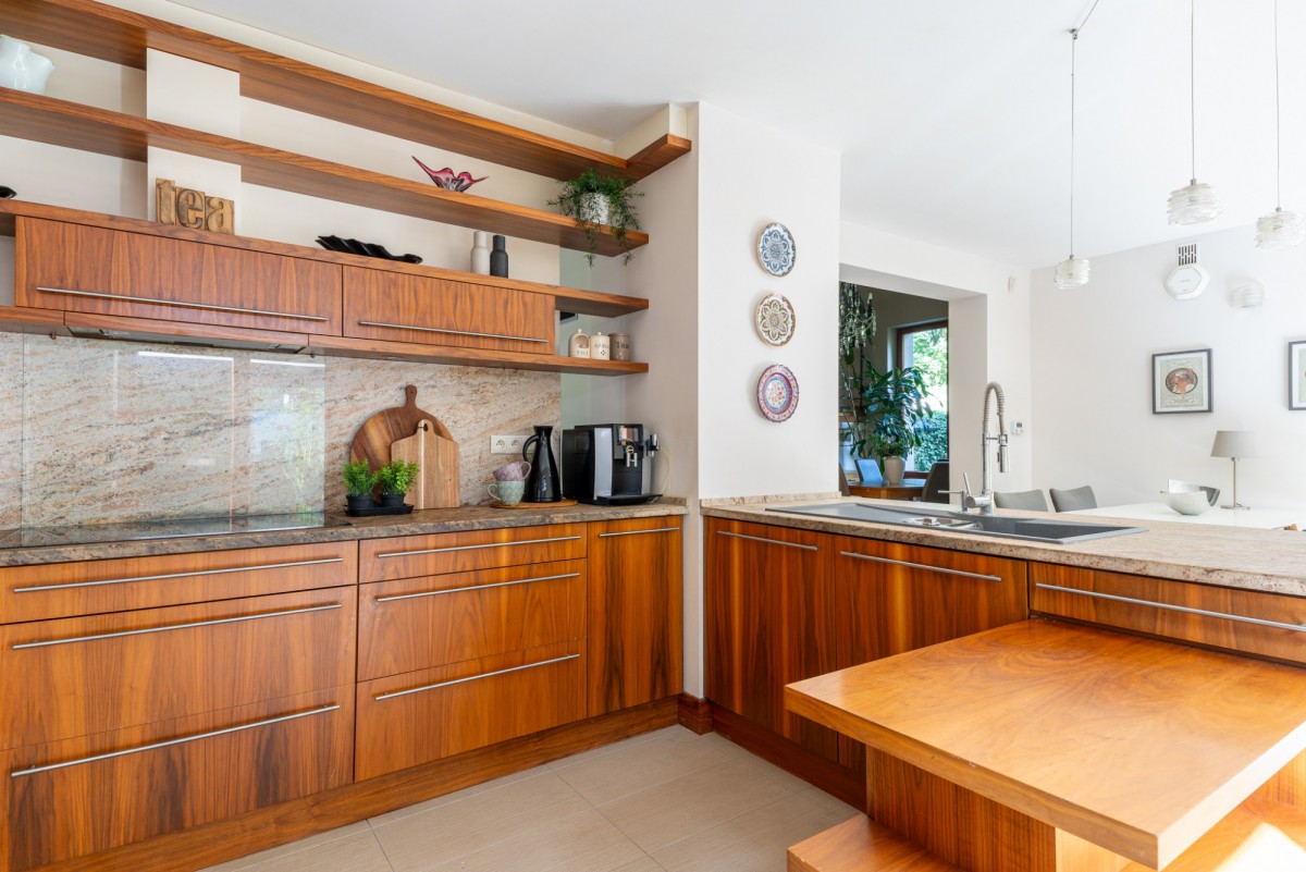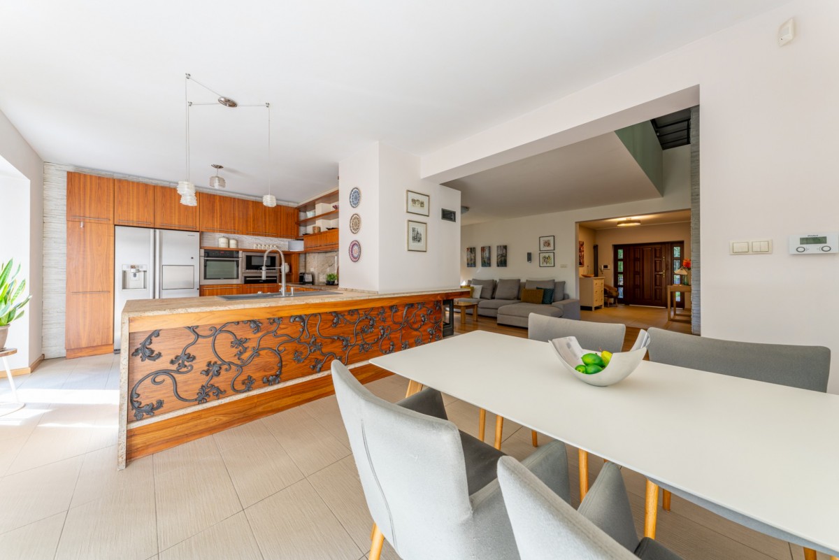 Parter z kolei obejmuje przestronny salon z kominkiem połączony z klimatyczną jadalnią z wysokim sufitem, oddzieloną barkiem, nowocześnie wyposażoną i pełną światła kuchnię z wyjściem na drugi taras, stylowy gabinet, garderobę w zabudowie i niewielkie pomieszczenie gospodarcze.