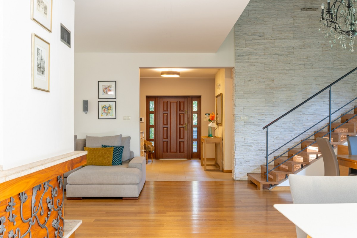 Dbałość o detale towarzysząca gospodarzom podczas urządzania 380 m2 powierzchni tego imponującego domu sprawia, że już od samego progu wyczuwalna jest tutaj niesamowita harmonia, którą dopełniono nutą nienachalnego luksusu. Stylowe meble, starannie dobrane detale, gustownie wykończone łazienki, liczne schowki i miejsca do przechowywania oraz pełne wyposażenie – słowem, wszystko dla komfortu rodziny!