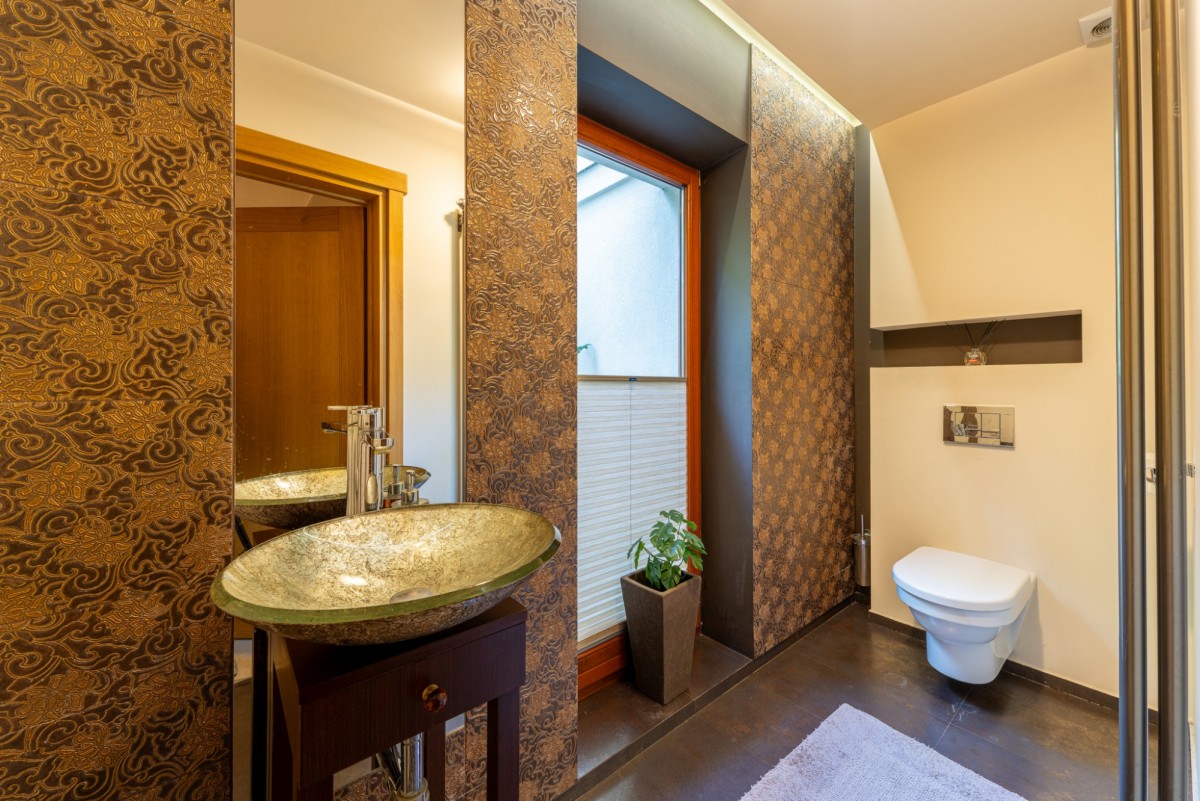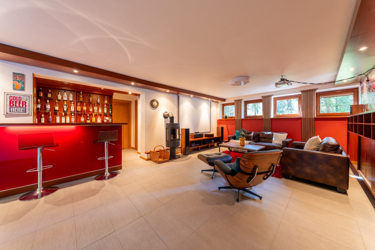 W podpiwniczeniu domu (z wyjściem na taras) znajduje się komfortowa strefa wypoczynku i rekreacji: pokój barowy z rzutnikiem, siłownia, łazienka z sauną, pokój gościnny, elegancka piwniczka winna, jak i świetnie wyposażone pomieszczenia gospodarcze (pralnia, kotłownia).