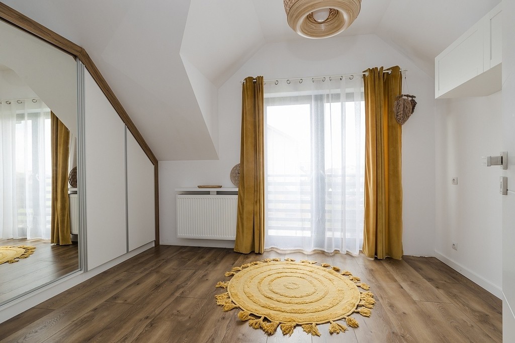 - Sypialnia główna (master) – doskonale doświetlone pomieszczenie z zachodnią ekspozycją, wyposażone w duże balkonowe okno z francuskim balkonem, z którego rozpościera się malowniczy widok na otaczającą zieleń i panoramę miasta w oddali. Sypialnia połączona jest z przestronną garderobą oraz prywatną łazienką z prysznicem i oknem dachowym typu Velux.