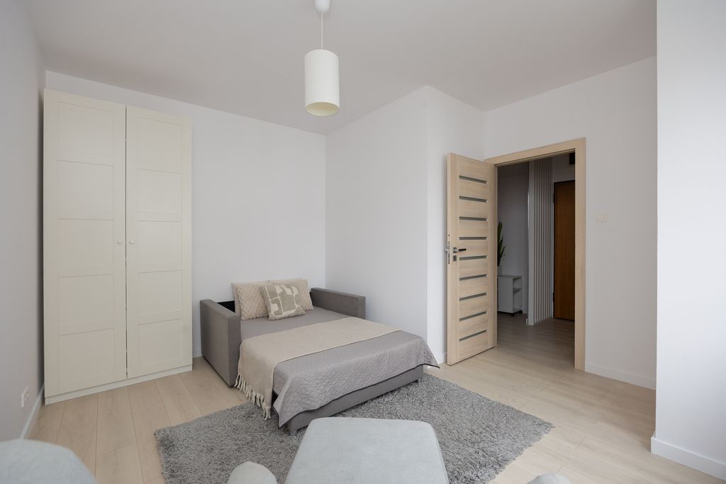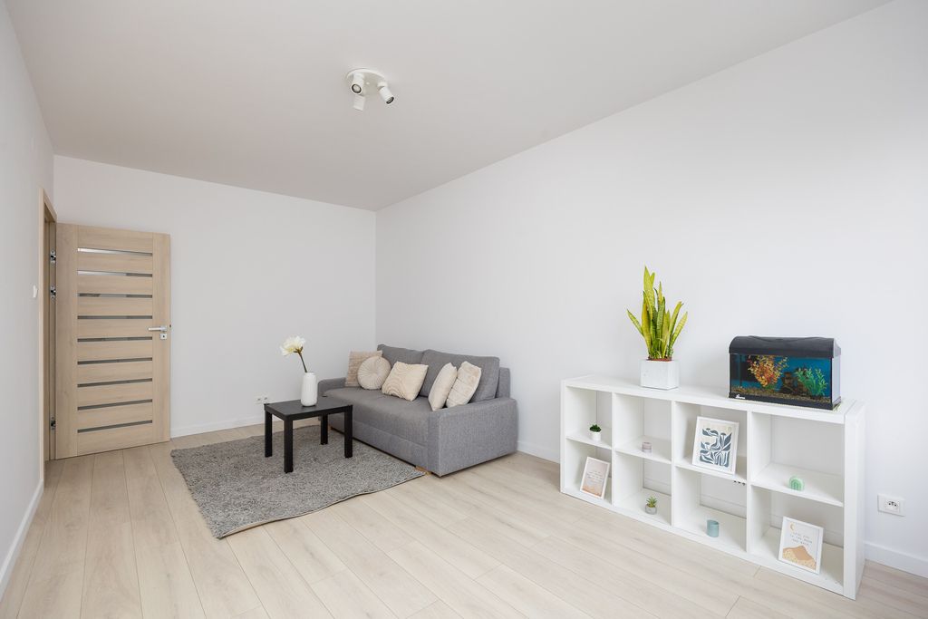 Wnętrze mieszkania jest utrzymane w stonowanej, neutralnej kolorystyce. Na podłogach znajdują się panele oraz gres. Mieszkanie jest dobrze doświetlone – dzięki ekspozycji okien na południe i wschód światło dzienne dociera do wszystkich pomieszczeń przez większość dnia.