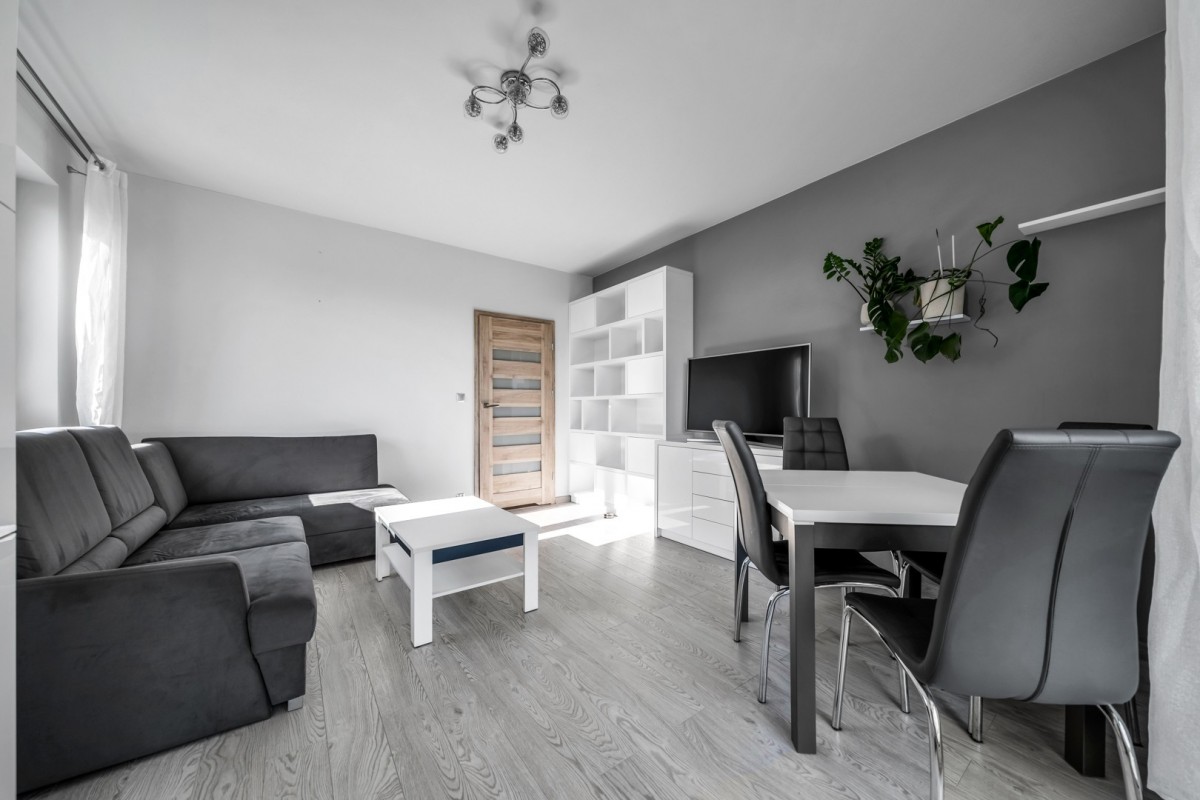 – przestronny salon z dużym narożnikiem (funkcja spania), stołem z czterema krzesłami, dwoma szafami oraz z wyjściem na balkon;