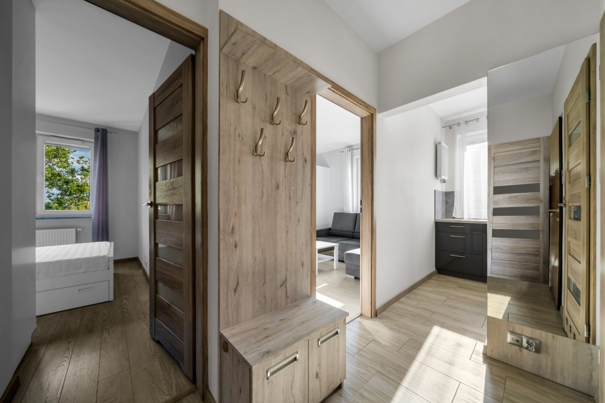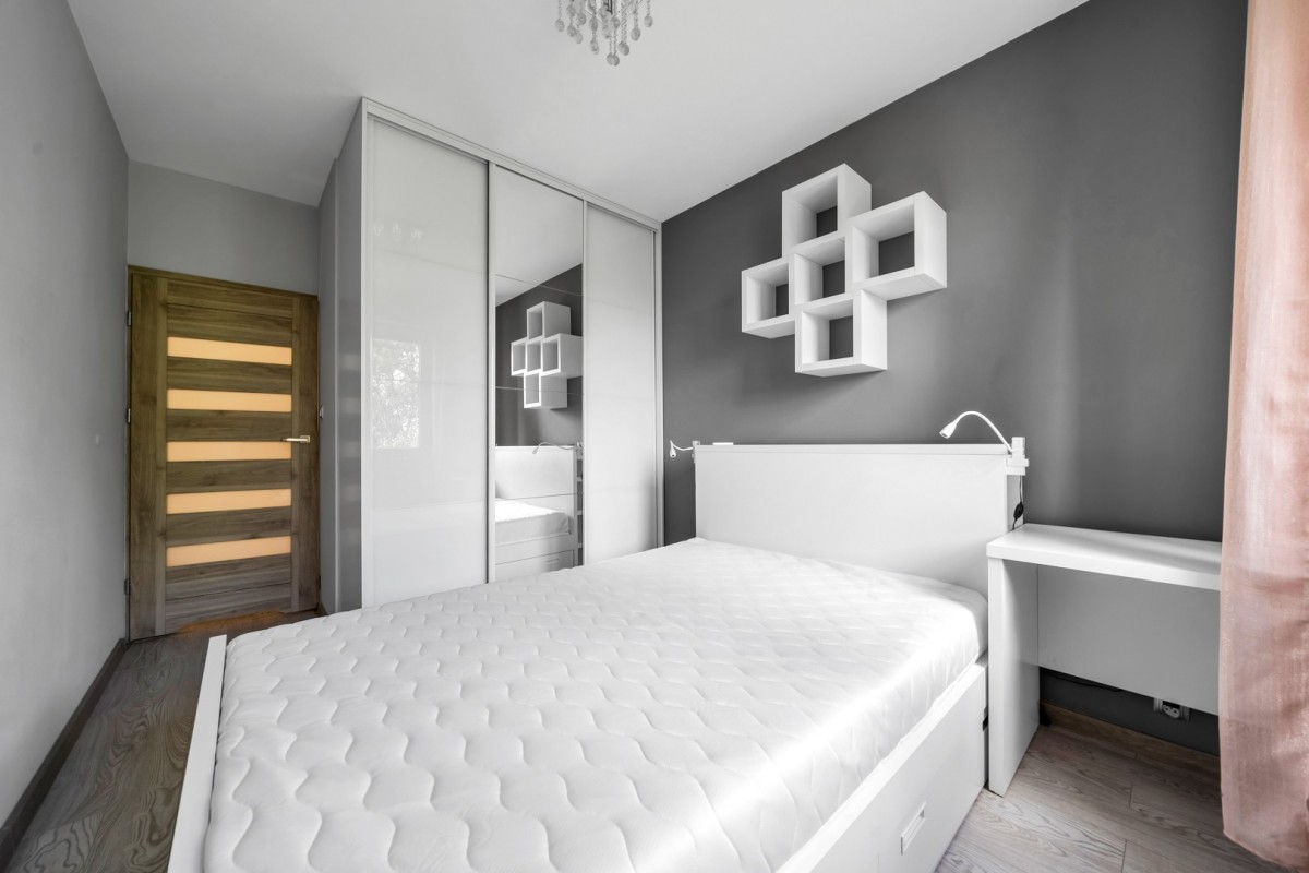 – sypialnia z dużym podwójnym łóżkiem, pojemną szafą oraz biurkiem/toaletką;