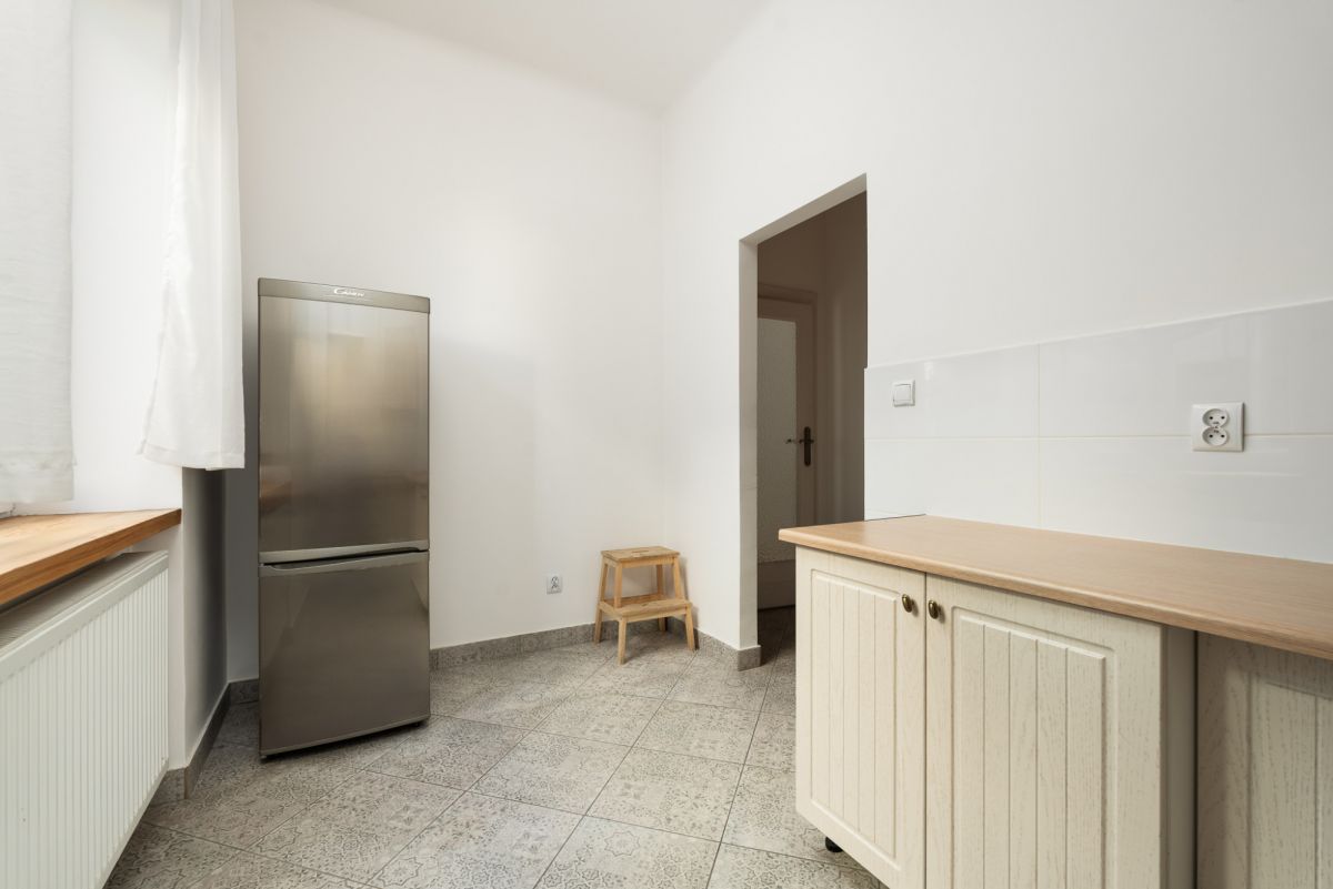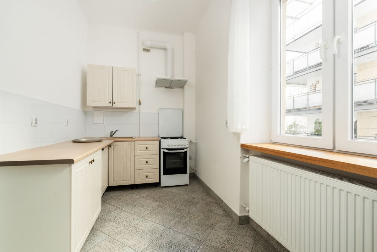 Jasna kuchnia z oknem i sąsiadujące z nią dodatkowe pomieszczenie dają szerokie możliwości aranżacji – od aneksu socjalnego po archiwum lub mały gabinet, a być może jadalnię.