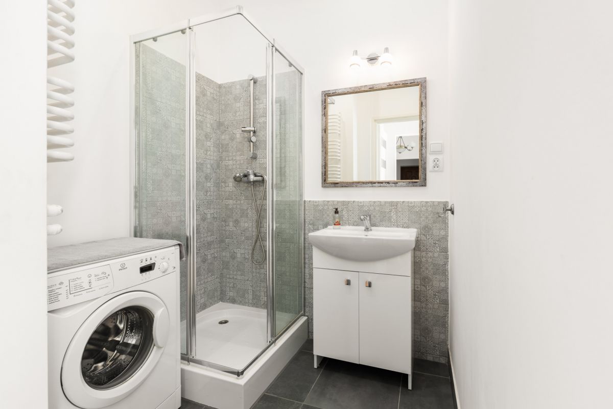 Oczywiście nie zabrakło łazienki z prysznicem i pralką oraz osobnej toalety.