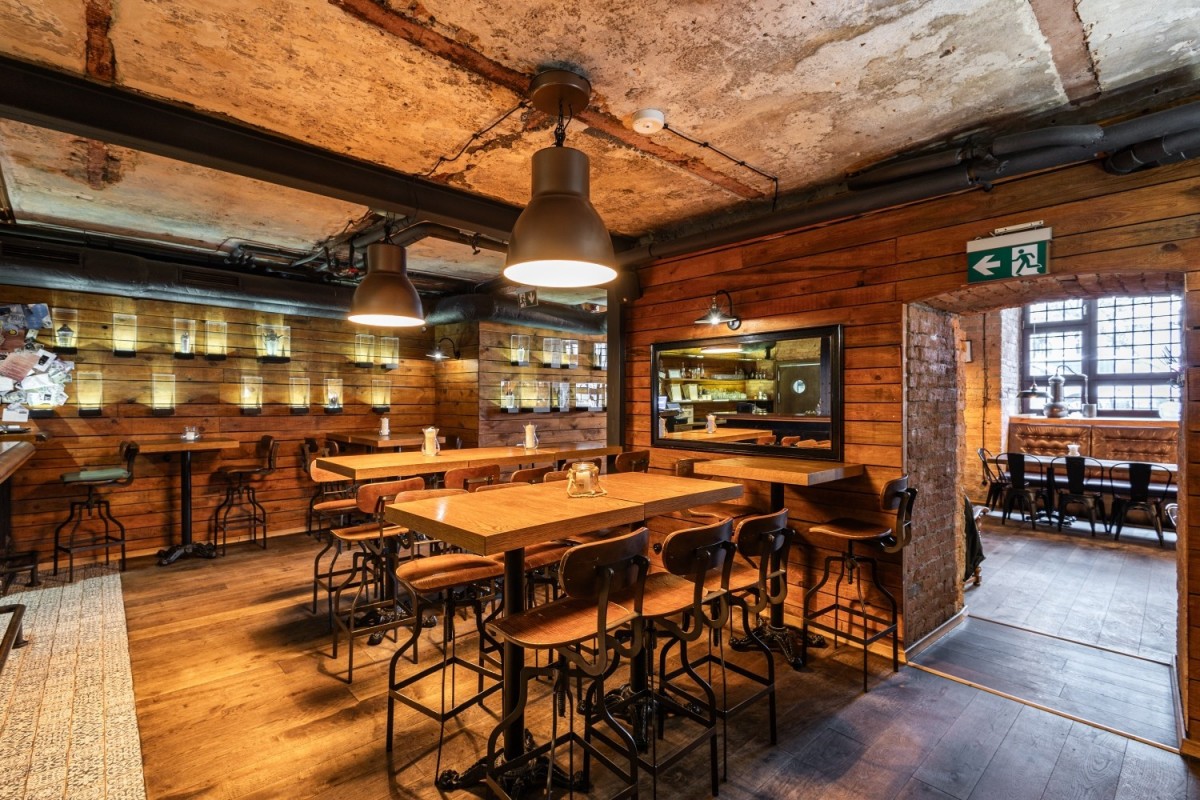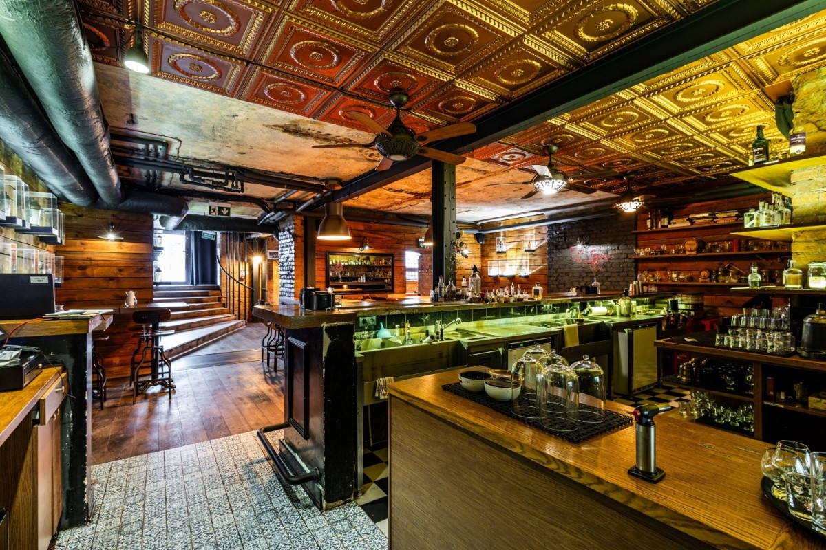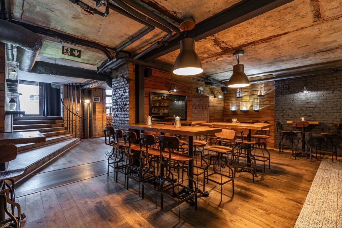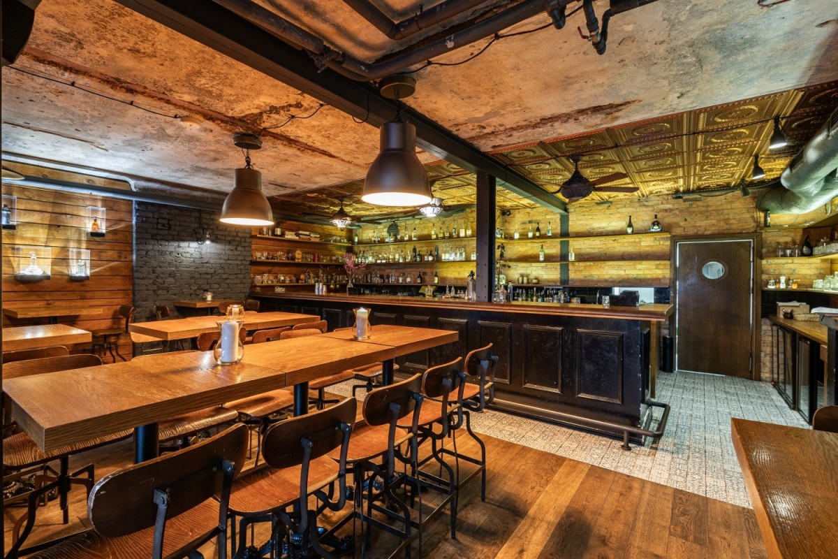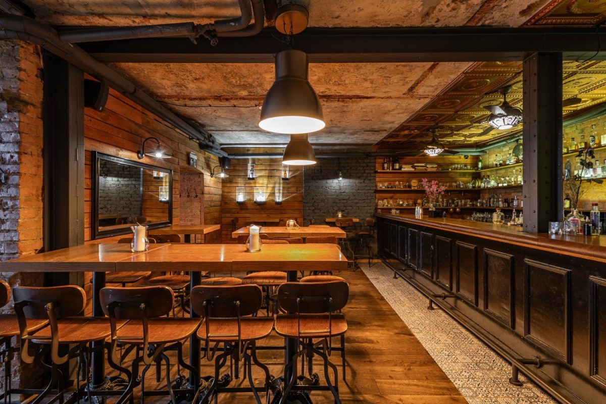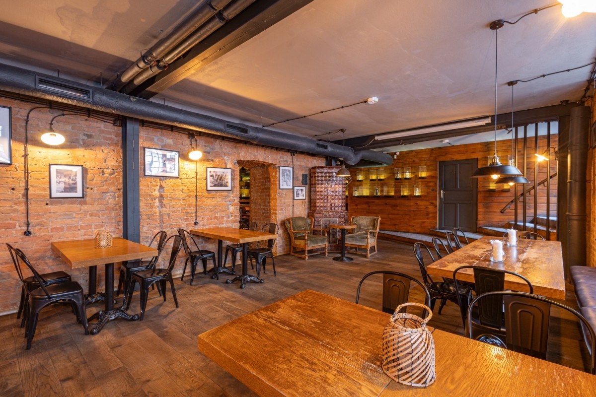 Elementy wystroju: Bar wykonany z drewna dębowego, dębowa podłoga, stoliki dębowe. Wszystko robione na zamówienie.