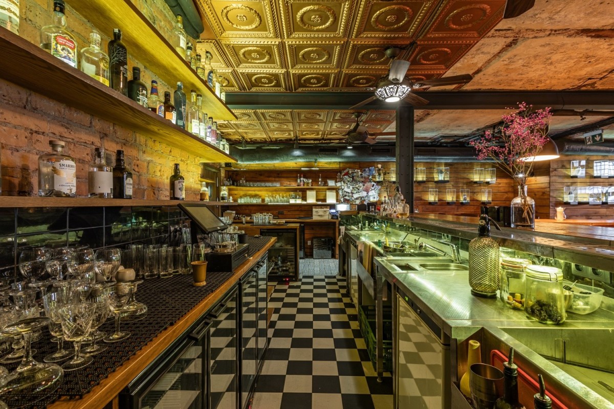 Zabudowa robocza kuchni oraz baru jest wykonana na zamówienie, pod wymiar, ze stali nierdzewnej. Na barze są to 3 sekcje barowe, z dostępem do bieżącej wody, przegrodami na lód i składniki, miejscem do krojenia, oraz śmietnikami na kółkach. Kuchnia jest w całości w zabudowie ze stali nierdzewnej.